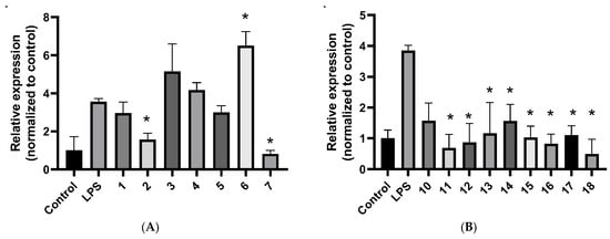 IL6 mRNA in LPS-stimulated A549 cells measured by real-time qPCR. (A): compounds 1–7 at 10 μM. (B): compounds 10–17 at 5 μM and 18 at 10 μM. Data are presented as mean ± SD (n = 3). * p < 0.05.