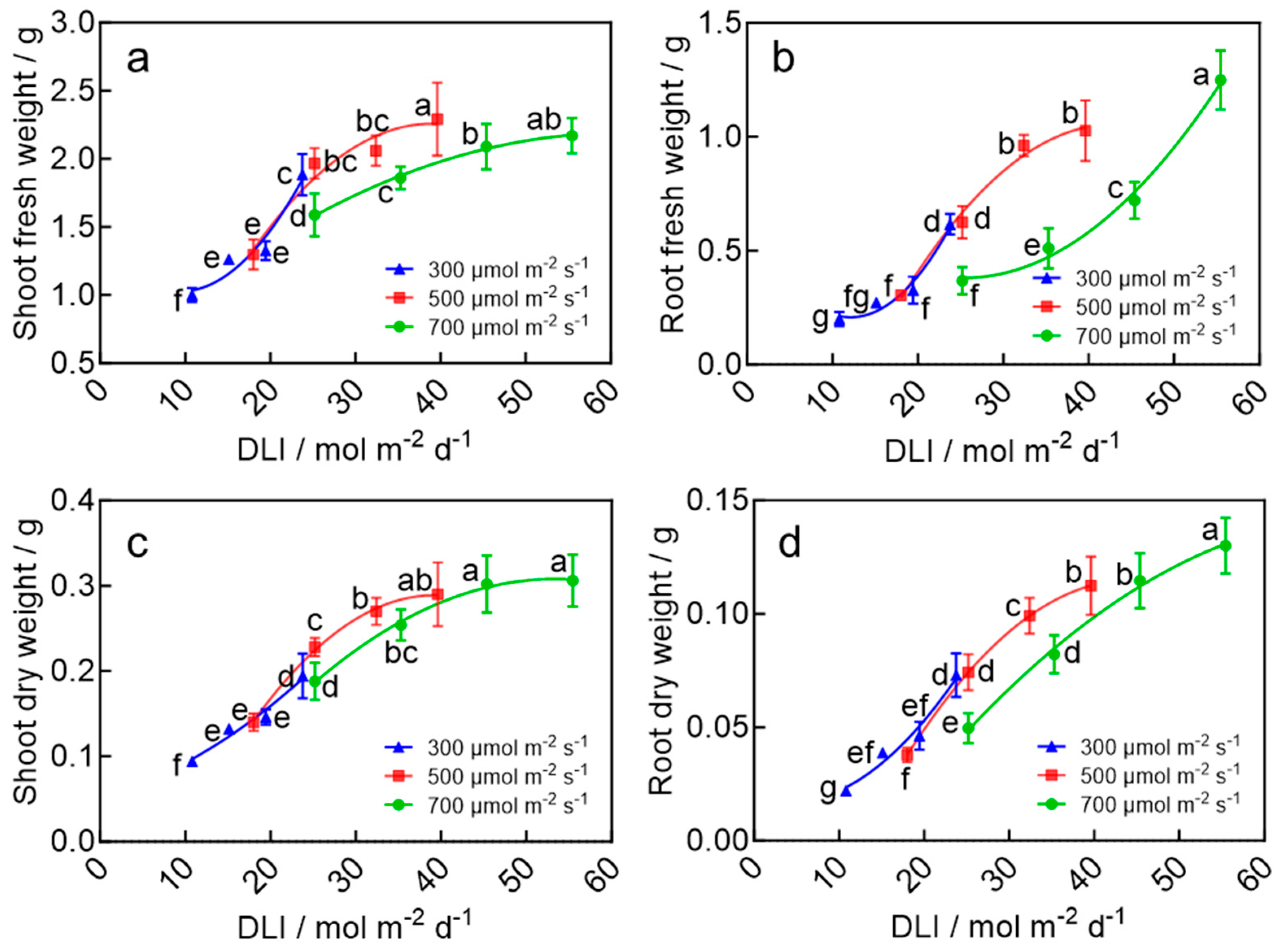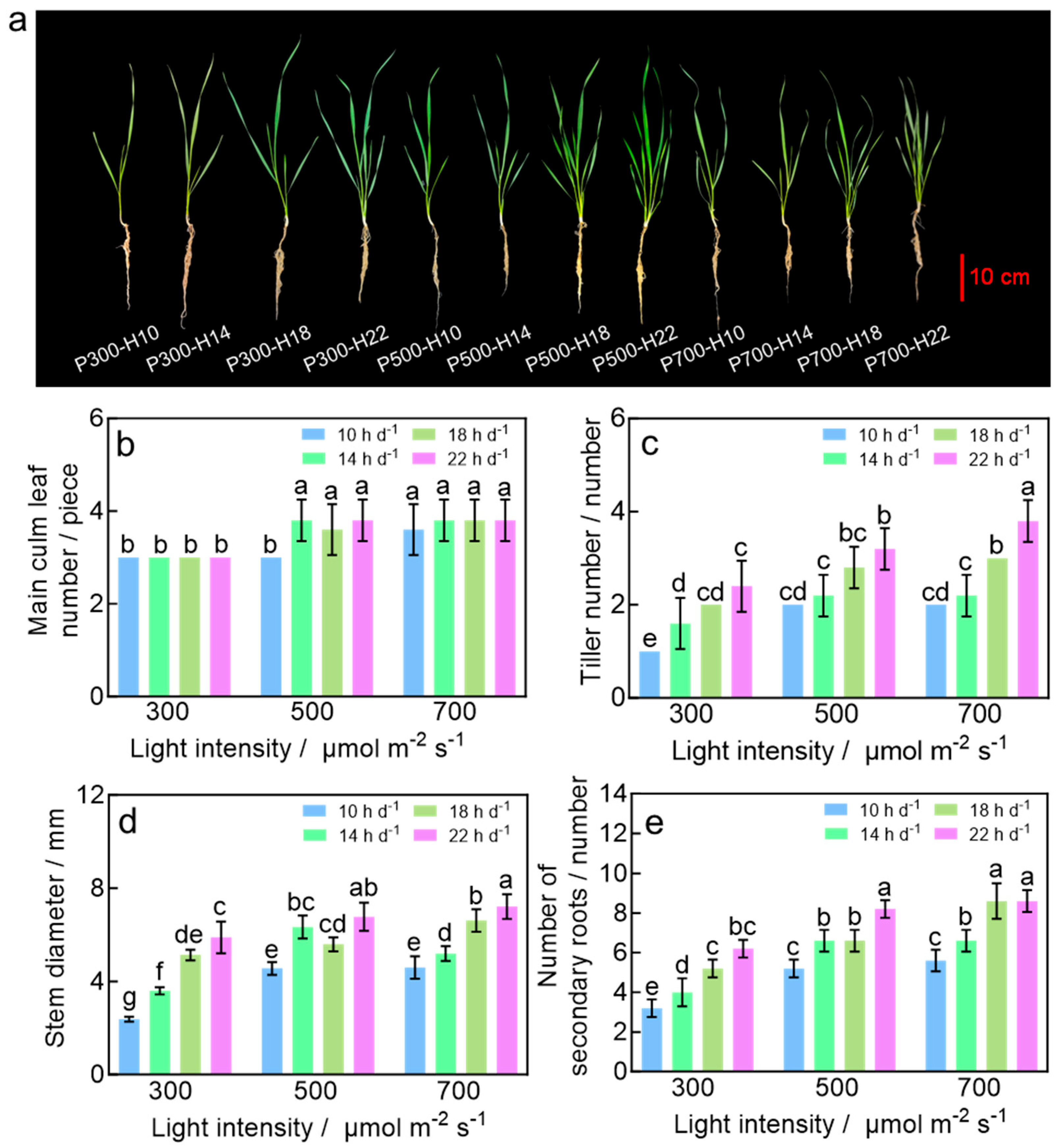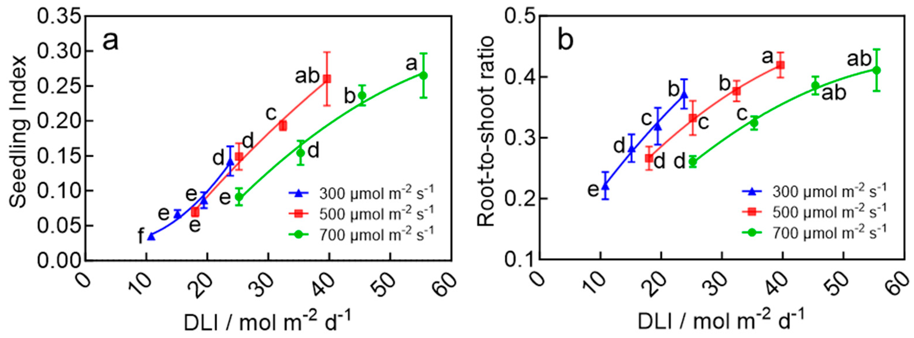 3.2. Higher DLI Promotes Tillering and Root Biomass Accumulation of Wheat Seedlings
