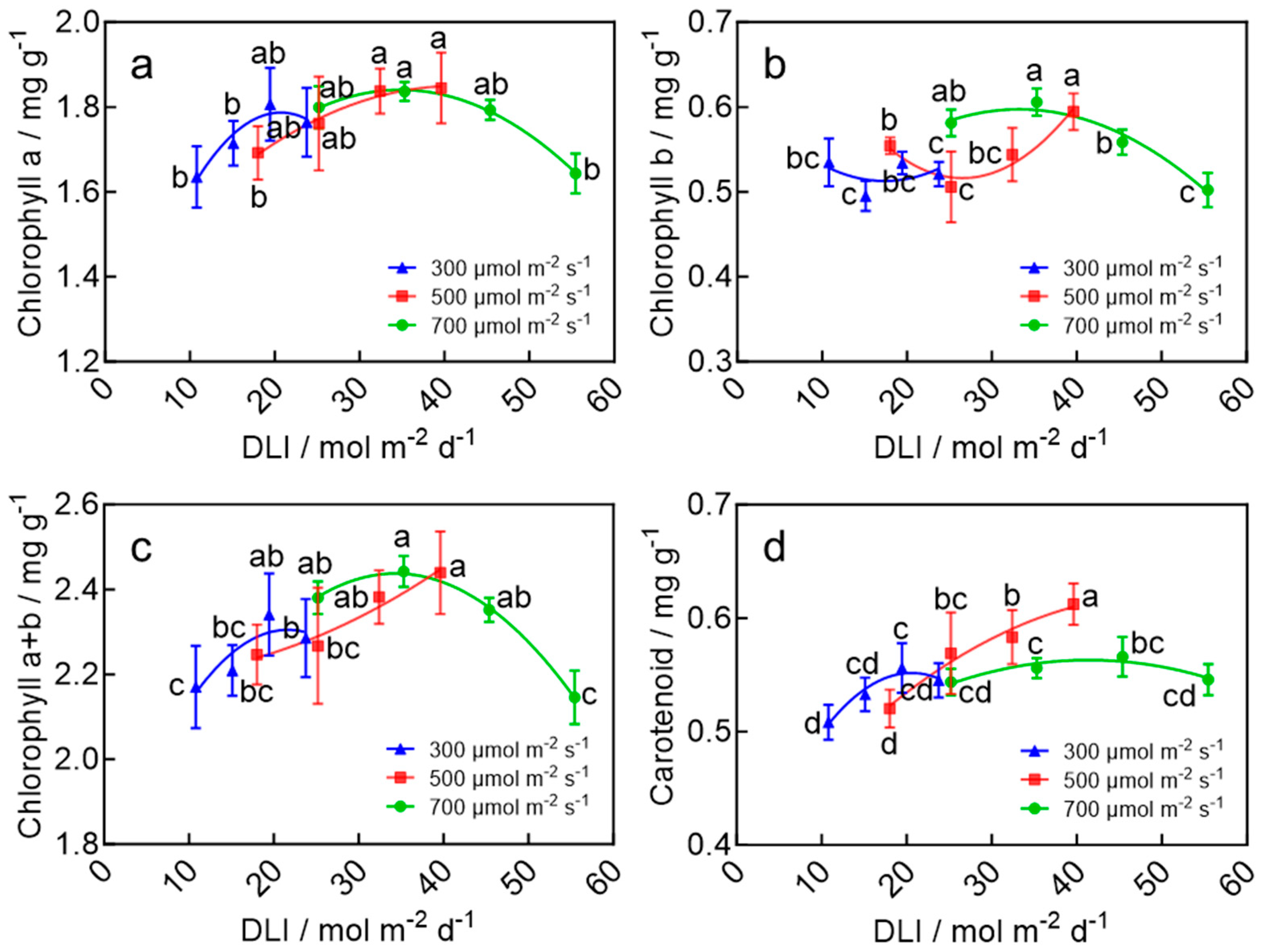 - Darko, E.; Heydarizadeh, P.; Schoefs, B.; Sabzalian, M.R. Photosynthesis under artificial light: The shift in primary and secondary metabolism. Philos. Trans. R. Soc. Lond. B Biol. Sci. 2014, 369, 20130243. [Google Scholar] [CrossRef] [PubMed]
