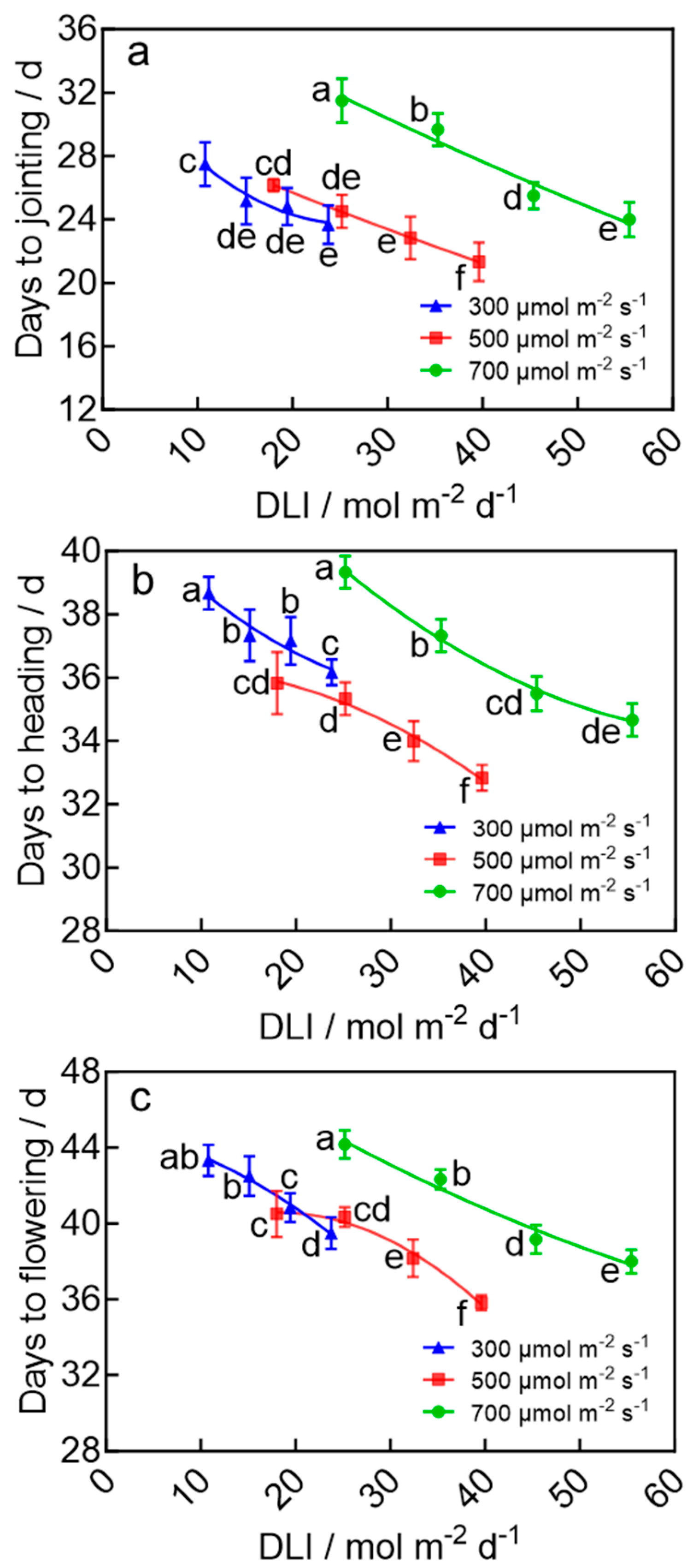 Chicago/Turabian StyleZhong, Luming, Xiang Ji, Jun Liu, Qing Zhou, and Dongxian He. 2026. "Optimizing Daily Light Integral in Seedling Stage Accelerates Heading and Flowering in Wheat Under LED Lighting" Plants 15, no. 2: 326. https://doi.org/10.3390/plants15020326