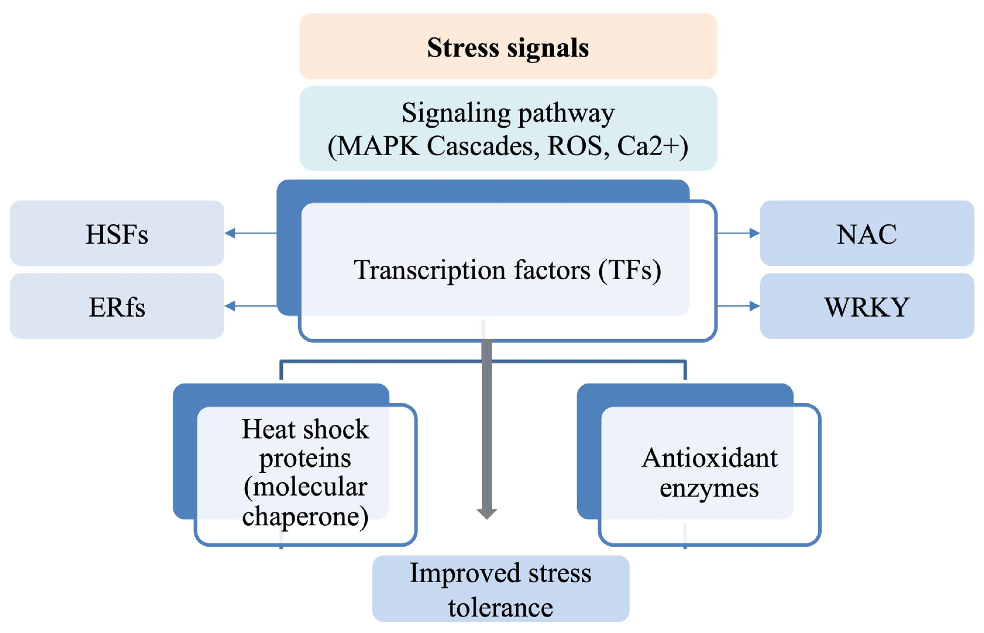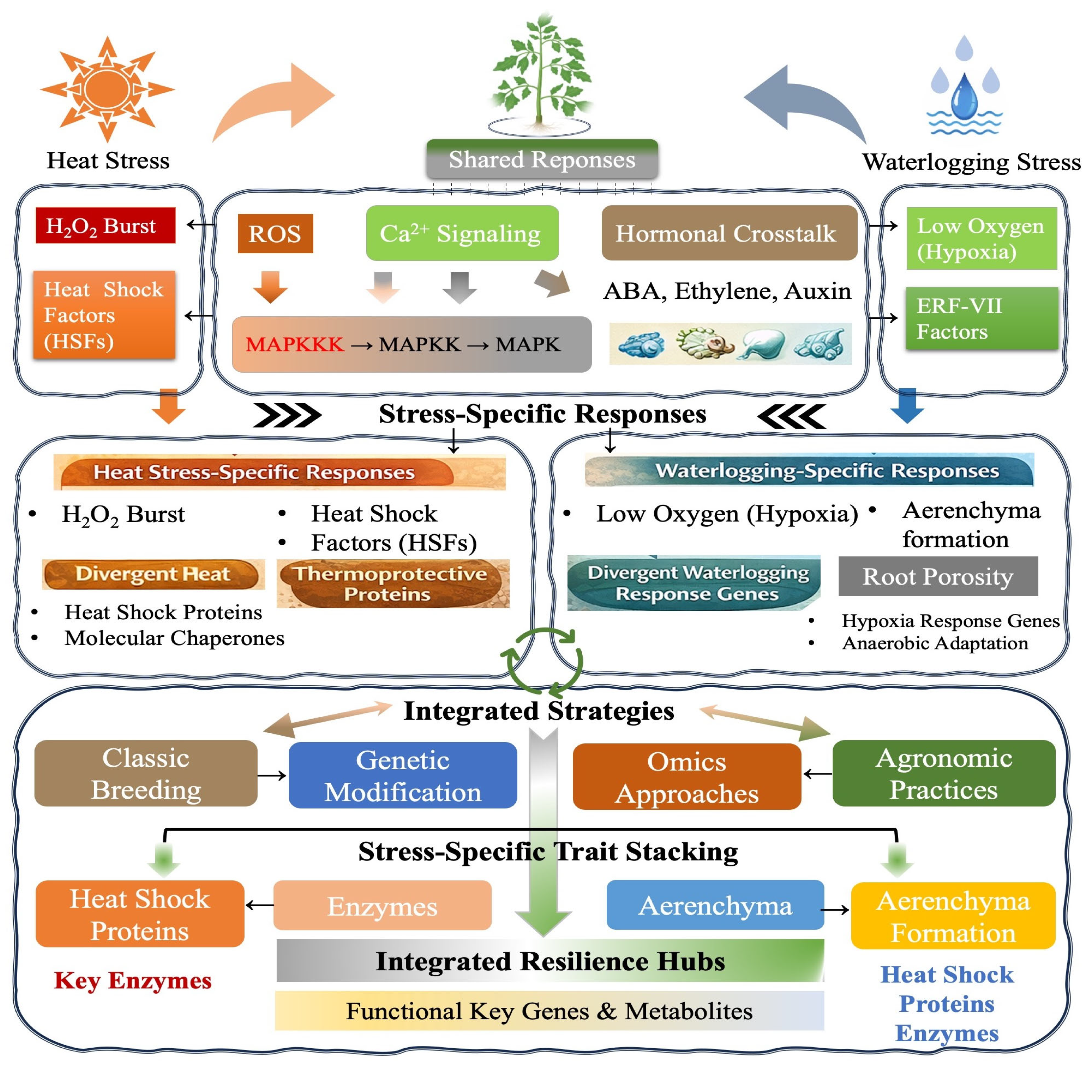 - Implementation Flow:Step 1: Characterize environmental stress patterns (heat only, waterlogging only, combined): Conduct a thorough assessment of the frequency, intensity, and timing of heat and waterlogging events in the target environment. Use historical climate data, predictive modeling, and in-field measurements to determine whether stresses occur independently or concurrently. For instance, in regions with seasonal monsoons followed by heat waves, crops may require stacked adaptations, while areas with sporadic heat events may benefit more from shared hub optimization. This step ensures that subsequent interventions are environmentally contextualized rather than generic [197].Step 2: Map key stress-specific and shared mechanisms: Identify the molecular, hormonal, physiological, and morphological pathways underlying tolerance to heat, waterlogging, and shared stress responses. Heat-specific mechanisms include HSF-HSP networks, ABA-mediated stomatal regulation, and thermos-tolerance-associated metabolites [198,199]. Waterlogging-specific mechanisms include ERF-VII transcription factors, aerenchyma and adventitious root formation, and anaerobic metabolism [200]. Shared hubs involve ROS scavenging, Ca2+-MAPK signaling, and antioxidant enzyme activation [195,198,199,200]. Mapping these pathways allows prioritization of targets for breeding, genome editing, or agronomic interventions.Step 3: Prioritize interventions targeting shared hubs or stress-specific stacks. For unpredictable or variable stress environments, prioritize interventions that enhance shared regulatory hubs to provide moderate tolerance to multiple stresses simultaneously [194,198]. For predictable dual-stress environments, implement trait stacking: combine stress-specific adaptations (e.g., HSP induction + ERF-VII-mediated root adaptations) to maximize resilience [197,201,202].Consider potential synergistic or antagonistic interactions between traits—for example, overexpressing HSPs may influence ROS dynamics, which also impact waterlogging tolerance—requiring integrated evaluation.Step 4: Select deployment pathways (breeding, editing, and agronomy) based on crop species and resource context. Decide whether interventions are best applied through molecular breeding, transgenic/genome-editing approaches, or agronomic management. Molecular breeding is suited for crops with extensive genomic resources and for stacking multiple loci. Transgenic or genome-editing approaches are optimal for precise modifications of key hubs, especially where trait stacking is required. Agronomic interventions—such as optimized irrigation, raised beds, or priming treatments—can complement genetic improvements and provide immediate stress mitigation [195,203]. The chosen deployment pathway should also consider economic feasibility, farmer adoption potential, and regulatory constraints.