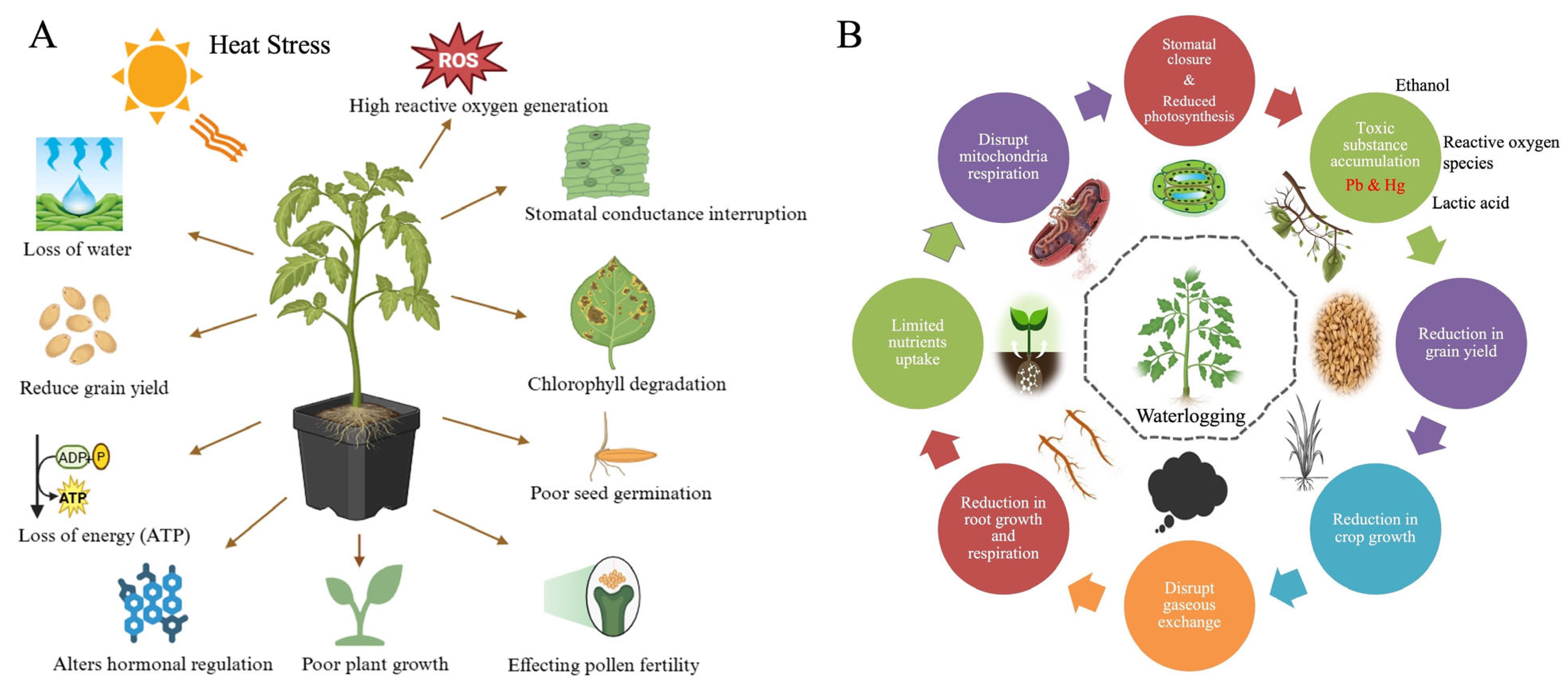 | Respiration | Increased initially, but inhibited at high temperatures, leading to energy loss. | Reduced due to oxygen deprivation, inhibiting root growth. | Both stresses impair energy production, but mechanisms differ: thermal inhibition vs. hypoxic limitation. |