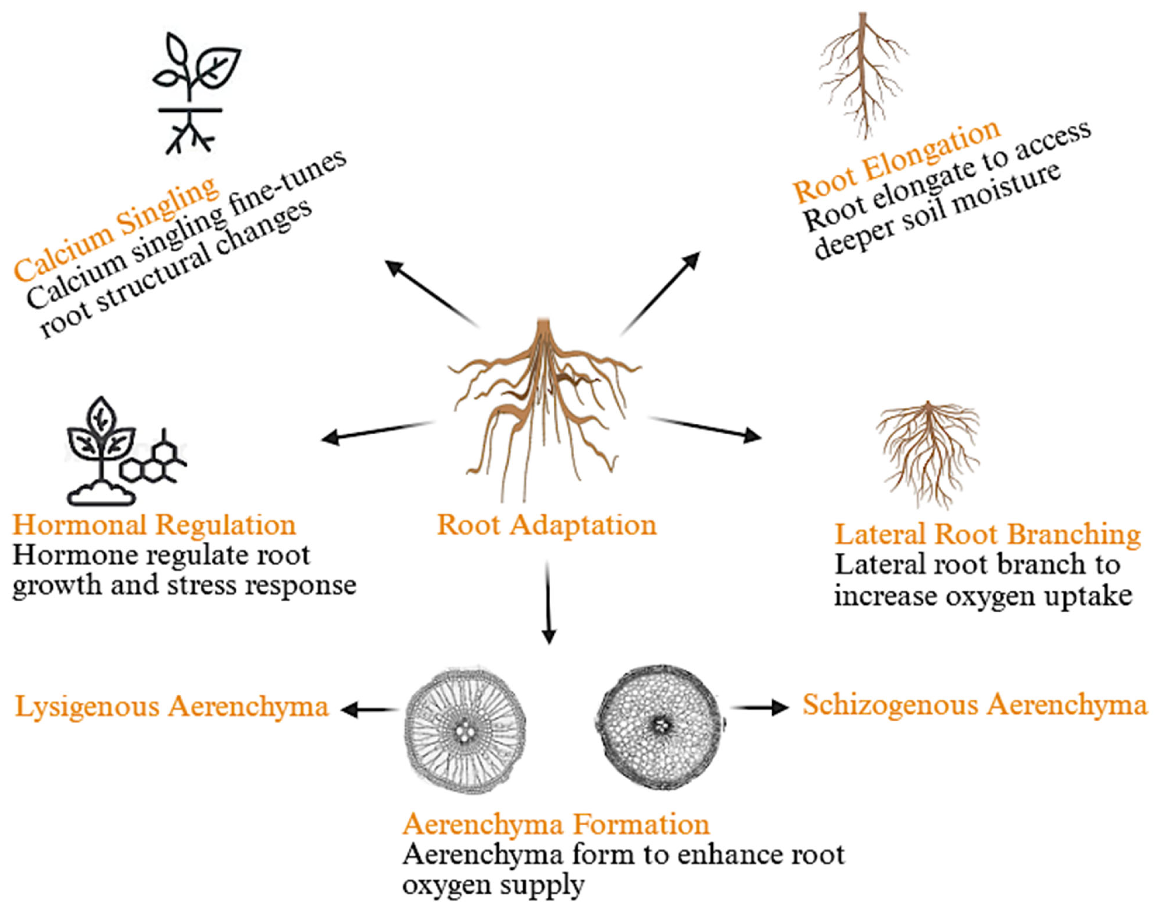 | Auxins | Root architecture regulation | Waterlogging | Interacts with cytokinins | Promotes root elongation and lateral root growth |