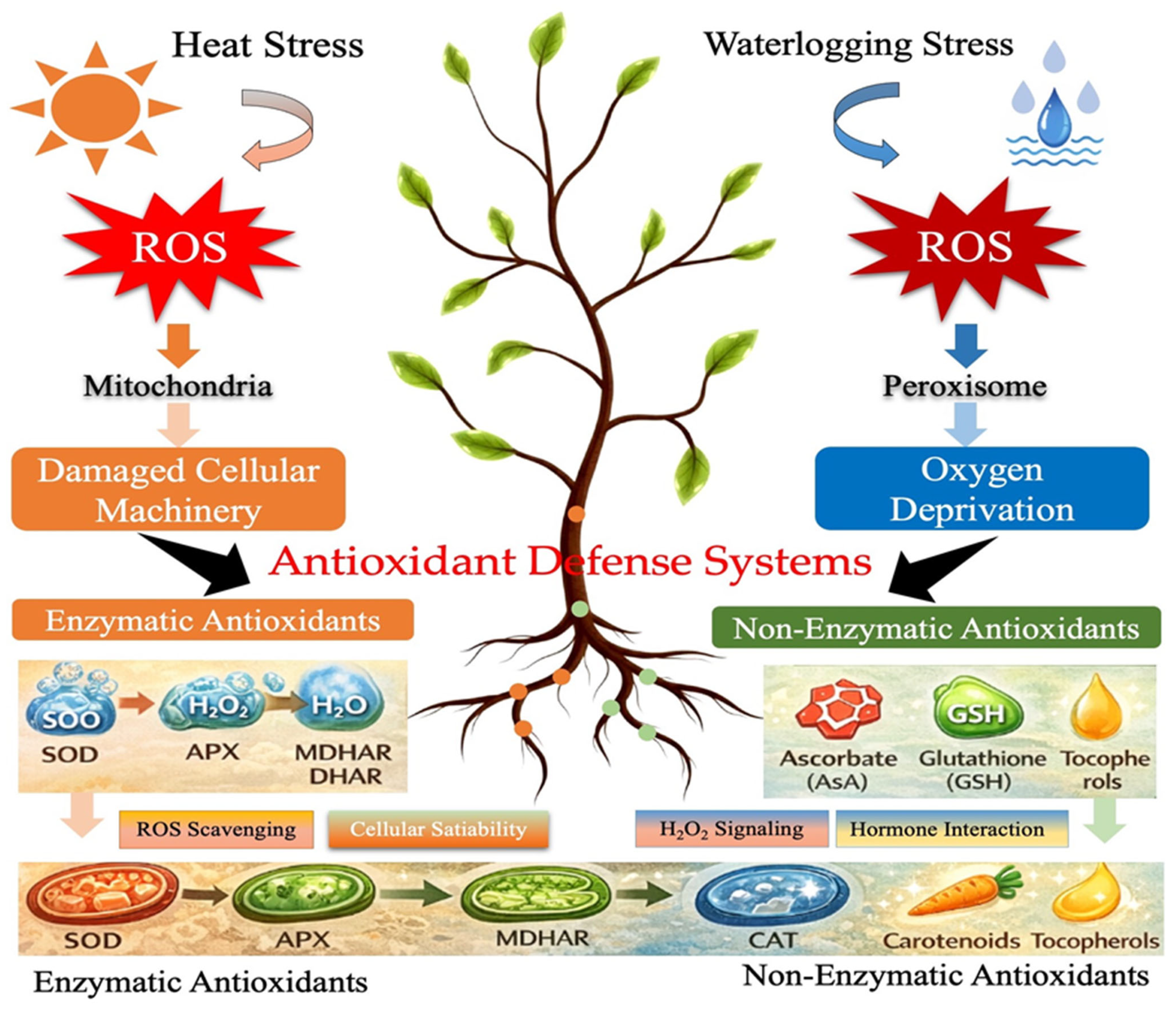 3.2. Antioxidant Defense Systems Against Heat and Waterlogging Stress