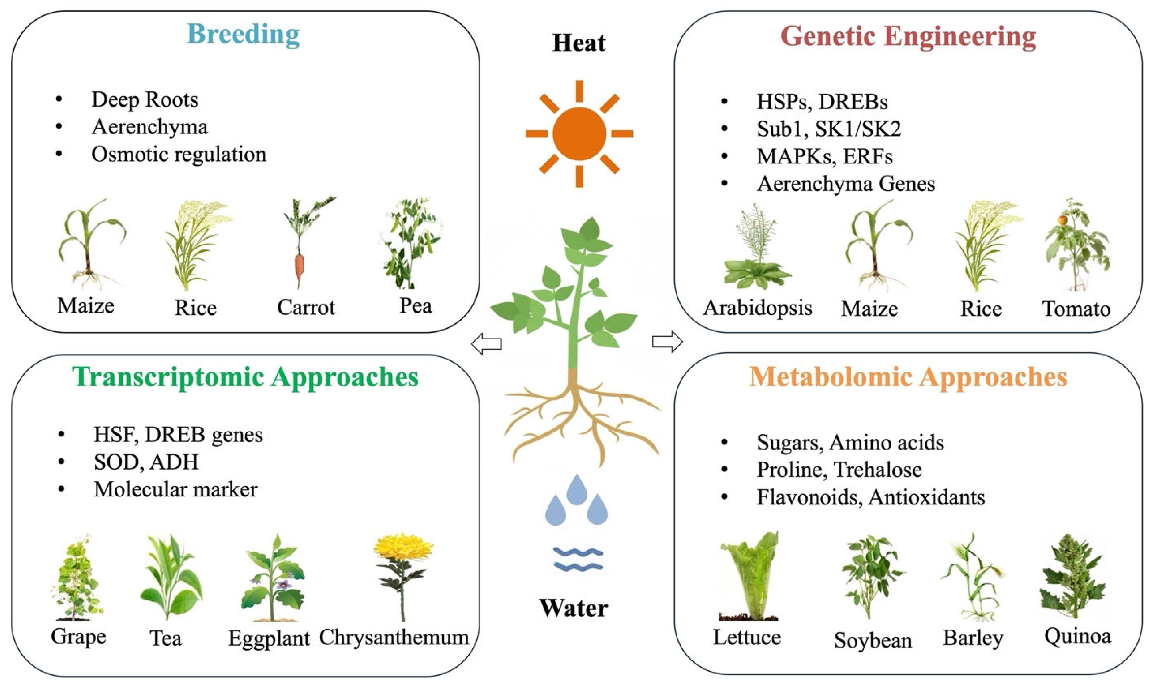 | Best Approach | Target shared mechanisms for broad resilience: By improving the plant’s ability to handle multiple stressors through shared regulatory hubs, crops become more resilient across a wide range of environmental conditions. | Stack stress-specific traits for local adaptation: By combining heat tolerance traits (HSPs) with waterlogging adaptations (ERF-VII), crops are optimized for the specific challenges of environments where these two stresses co-occur regularly. |