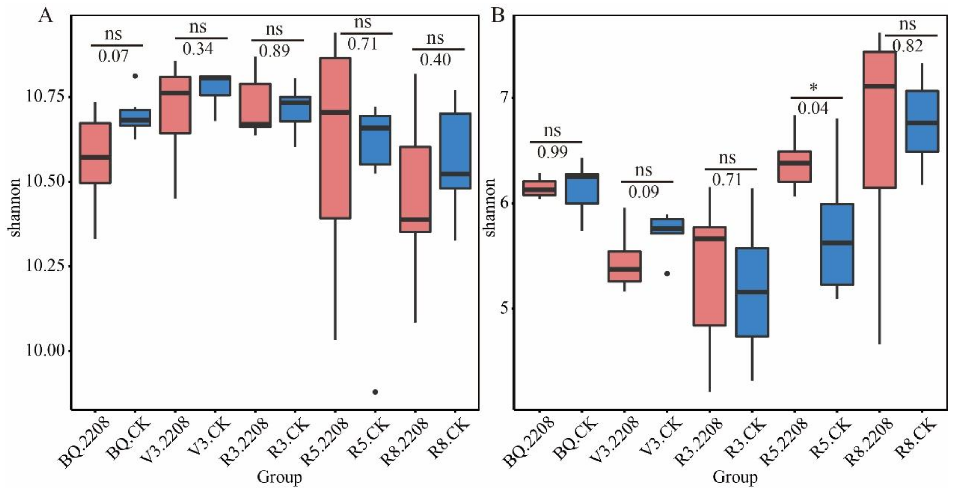 3.3. The Influence of GMO on Microbial Alpha Diversity of Soybean