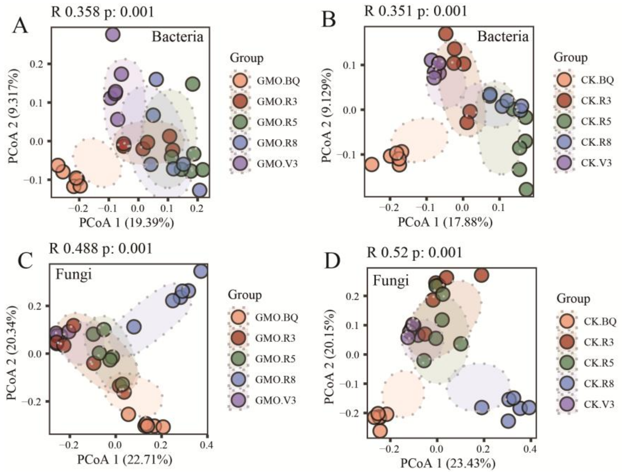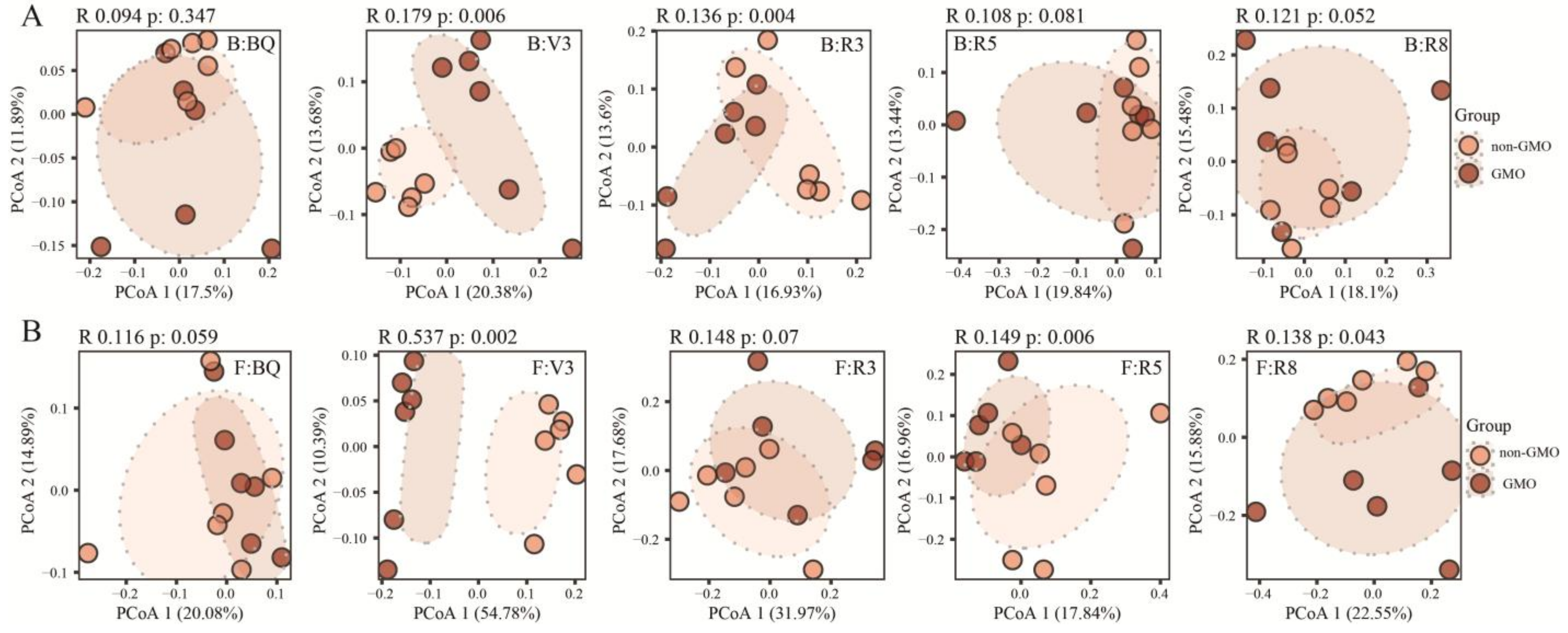 3.4. The Influence of GMO on Microbial Beta Diversity of Soybean