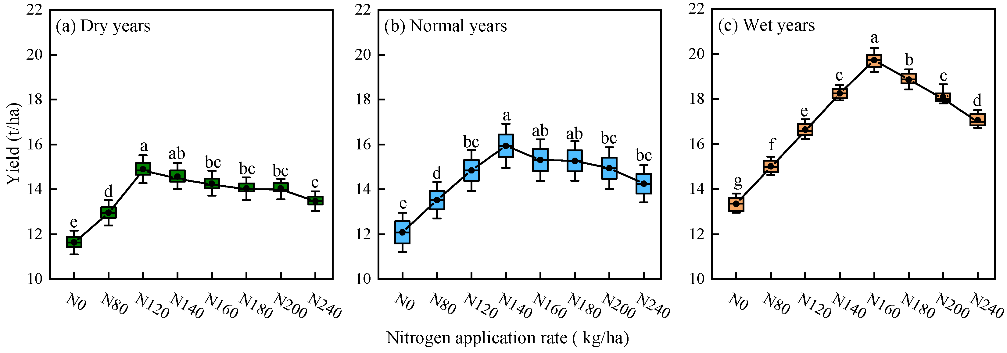 - Based on simulations using the calibrated APSIM–Lucerne model, the optimal nitrogen application thresholds for alfalfa under dry, normal, and wet years are in the ranges of 107–140, 135–160, and 150–183 kg/ha, respectively.