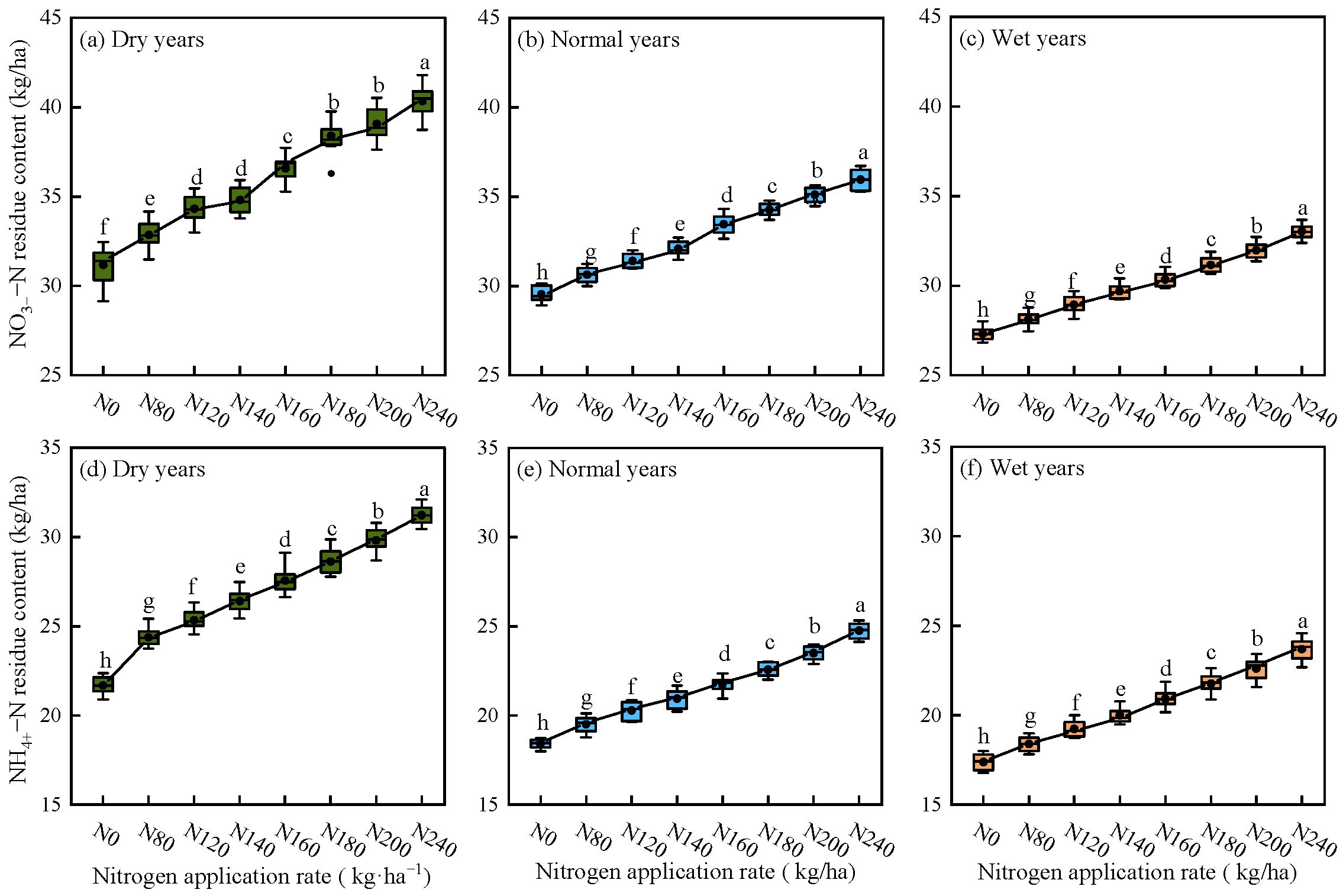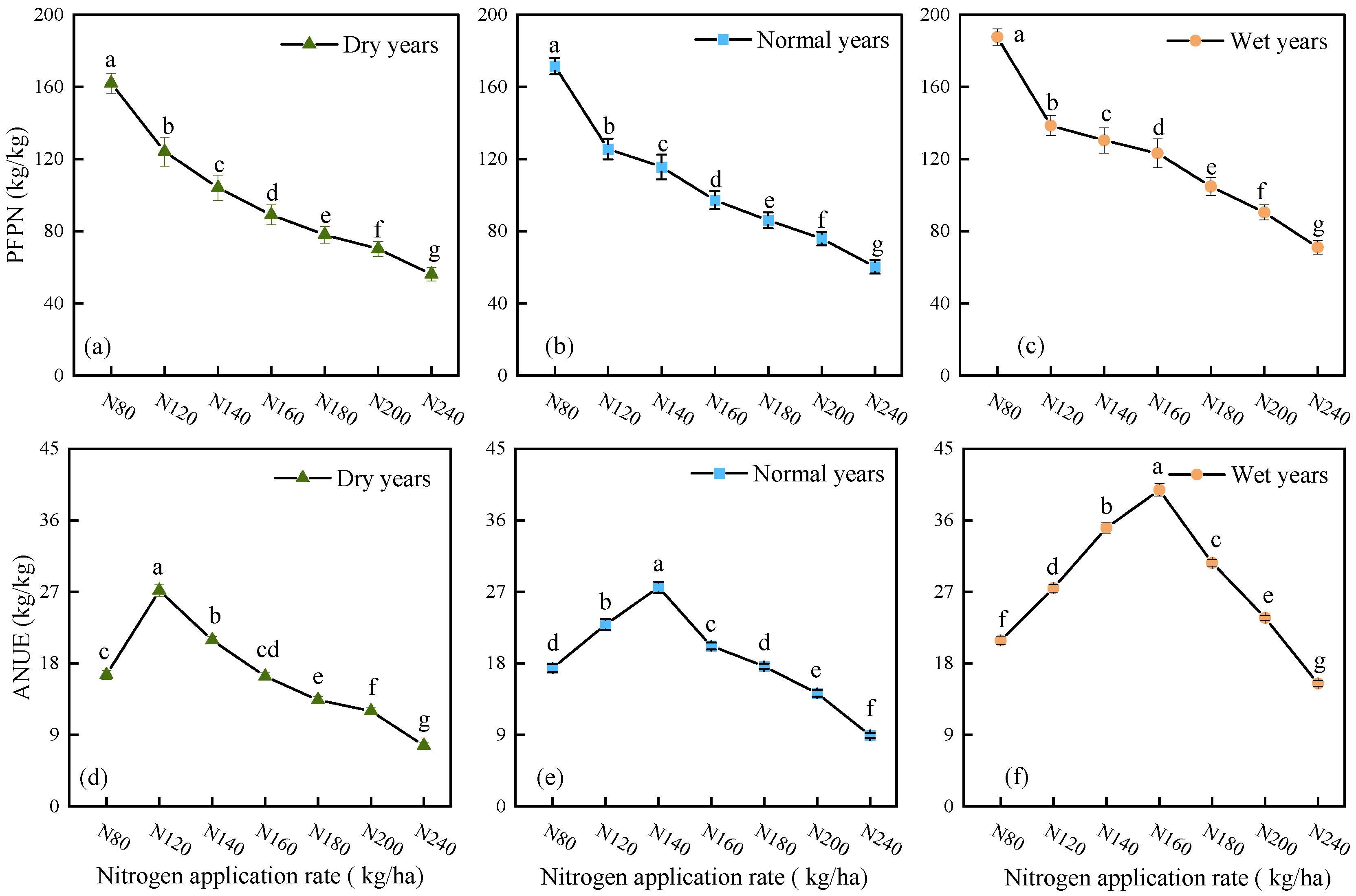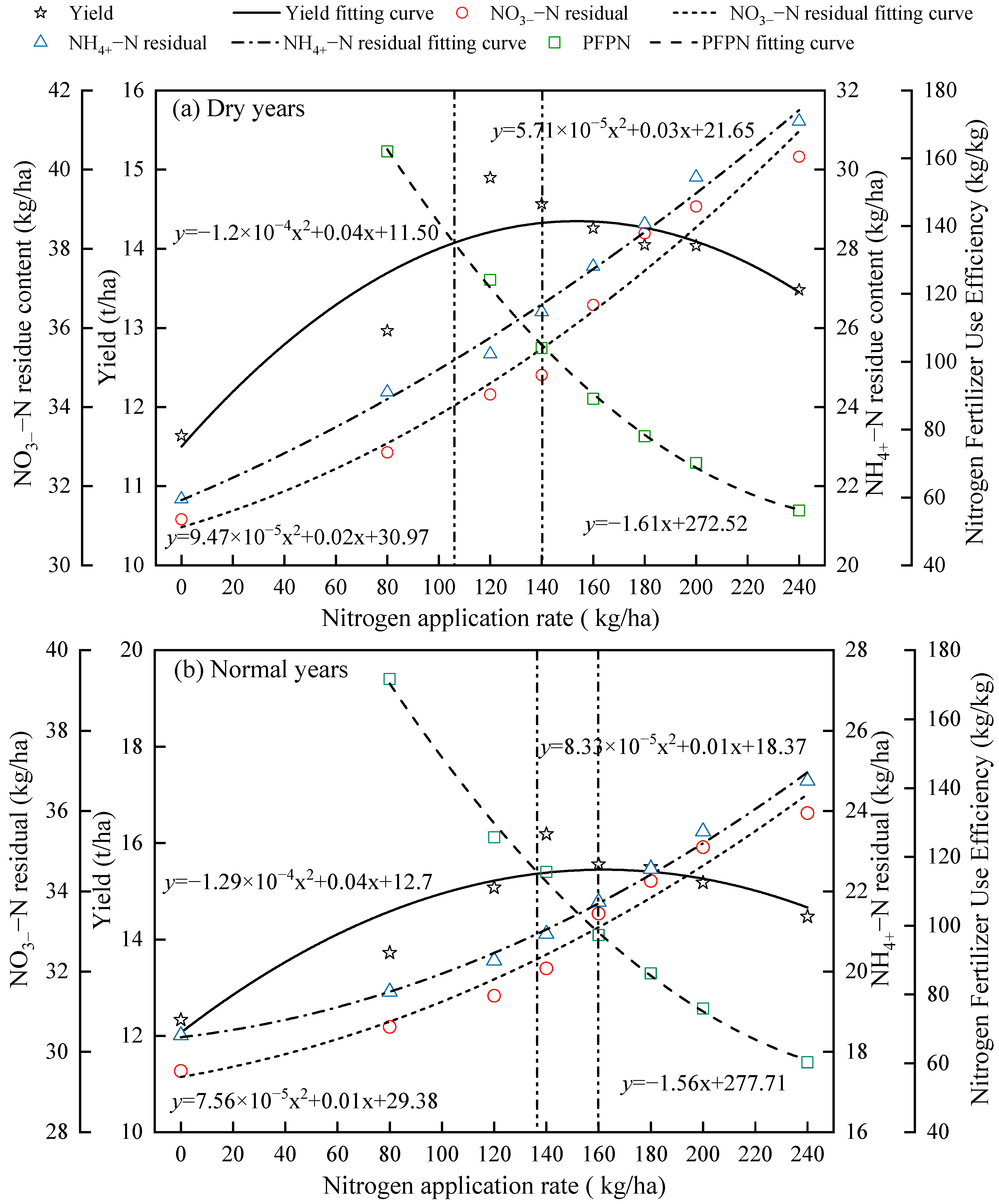 - Under different precipitation patterns, alfalfa yield and ANUE exhibited a non-linear response, initially increasing and then decreasing with higher nitrogen application rates. As nitrogen application levels increased, significant accumulation of soil residual NO3−–N and NH4+–N was observed; however, the PFPN consistently declined with increasing nitrogen application rates.