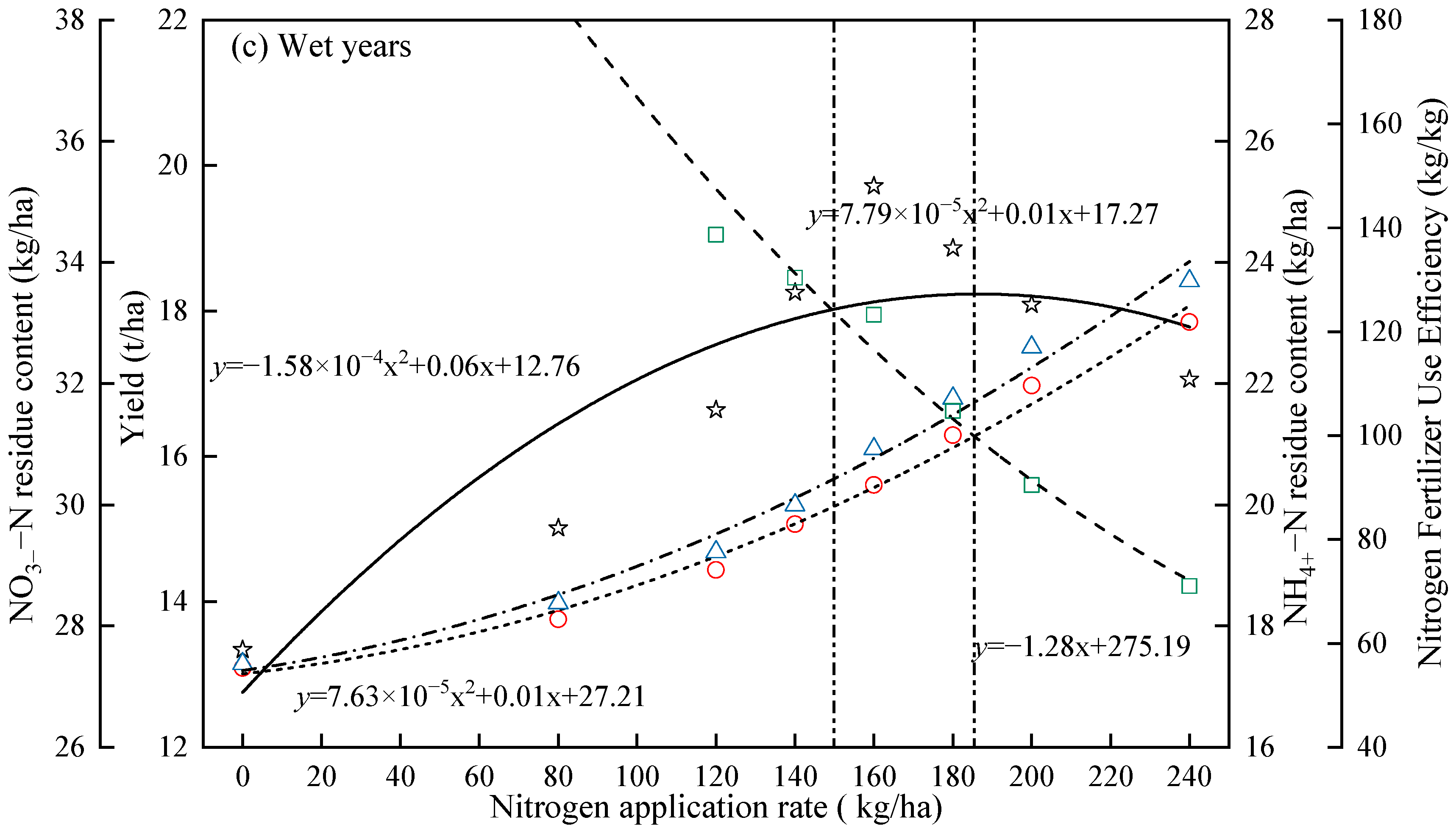 2.4. Interrelationship Among Alfalfa Yield, Soil NO3−–N and NH4+–N Residuals, Nitrogen Fertilizer Use Efficiency, and Nitrogen Application Rate