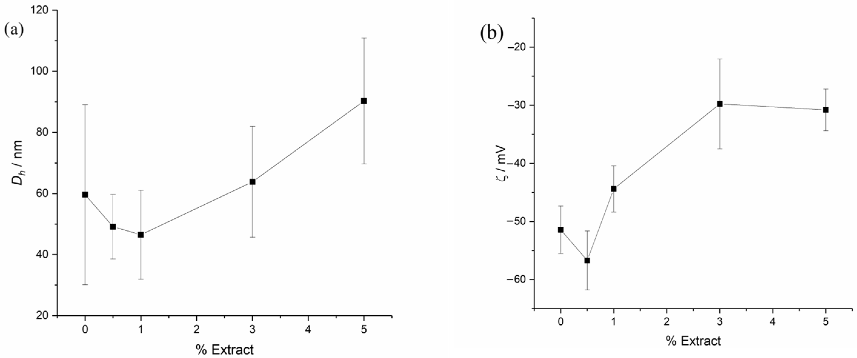 ZP generally increase with increasing extract concentration. As observed, there is a trend of size reduction to 1% extract, after which it increases. Furthermore, a slight increase in the zeta potential modulus is observed, which then starts to decrease.