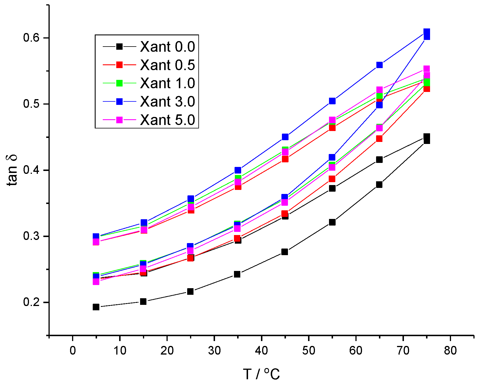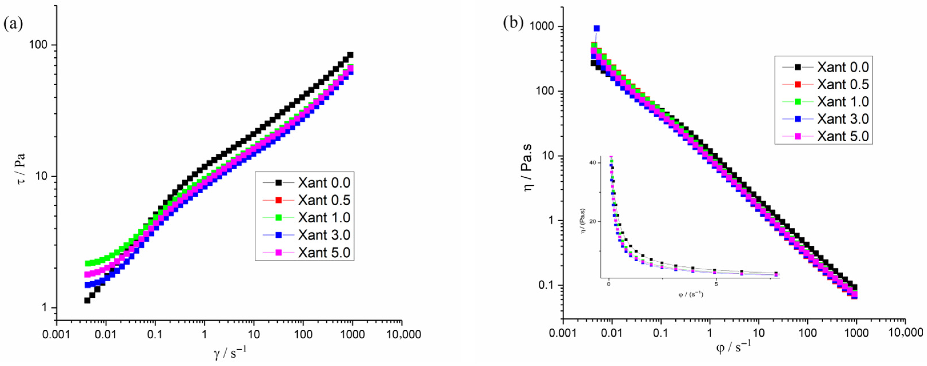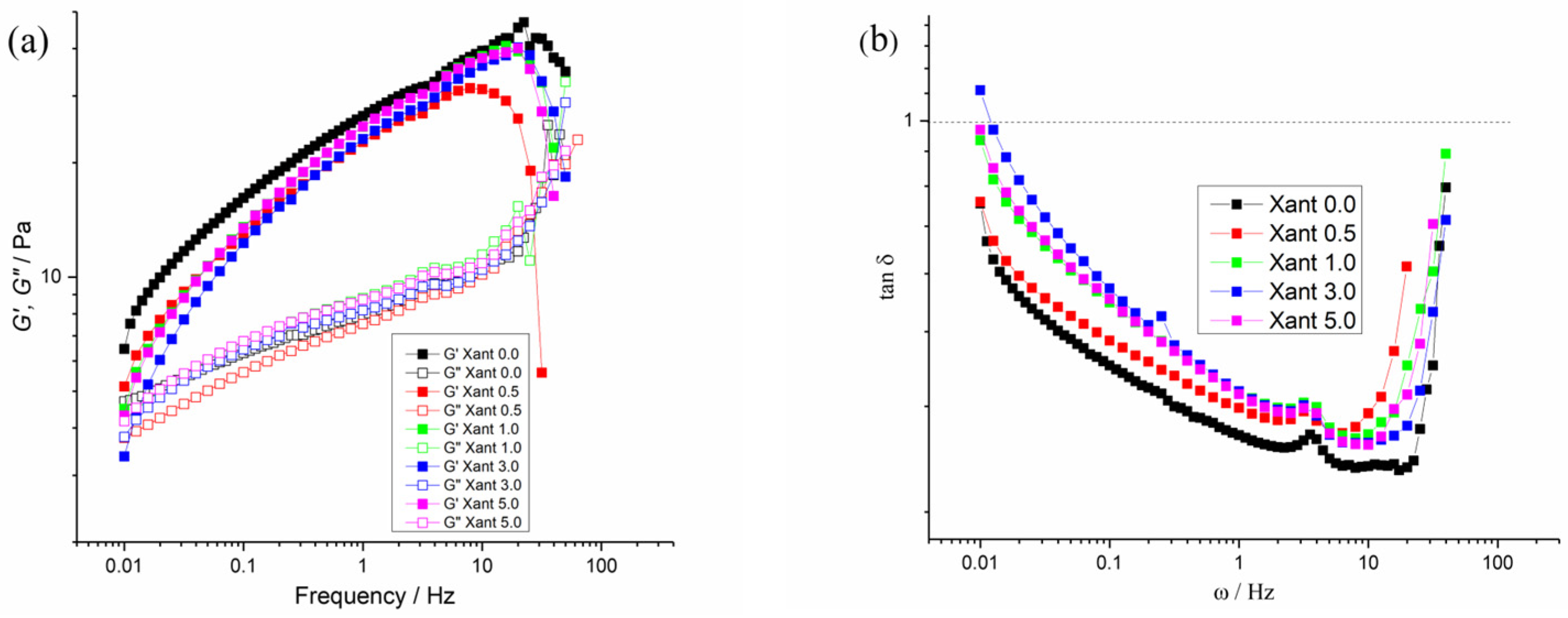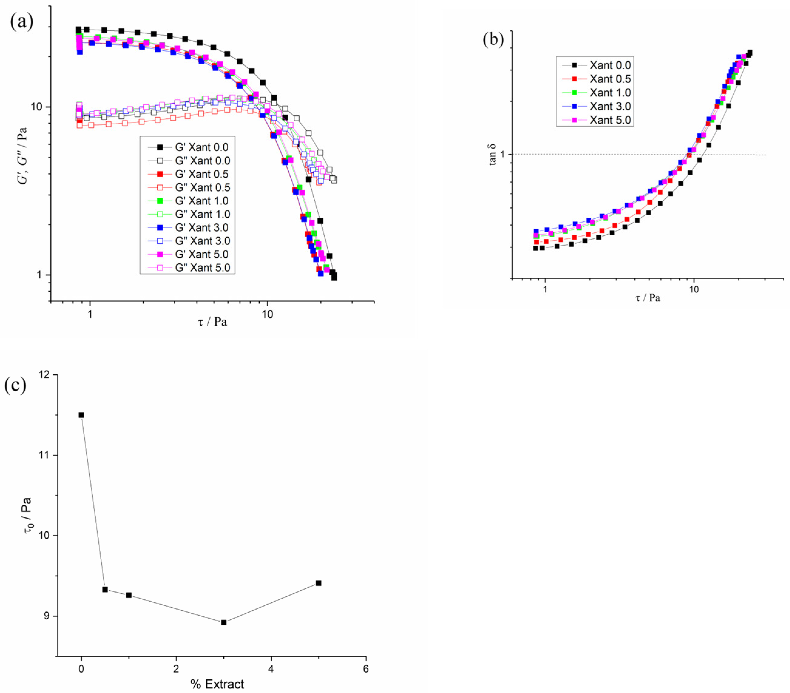 Figure 2a illustrates the viscoelastic behaviors for the Xant 0.0 to 5.0% of extract. Independent of the structuration degree, all fluids exhibited a reduction in