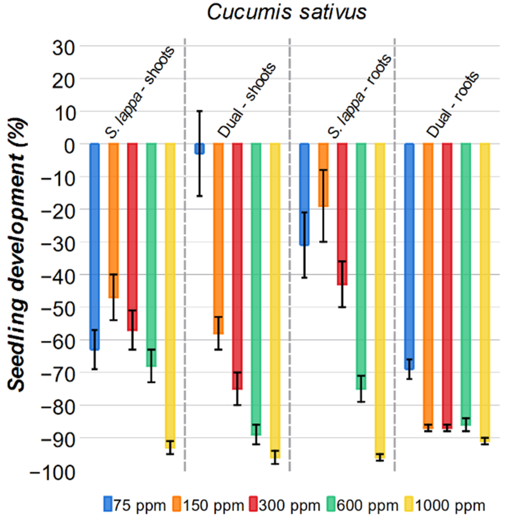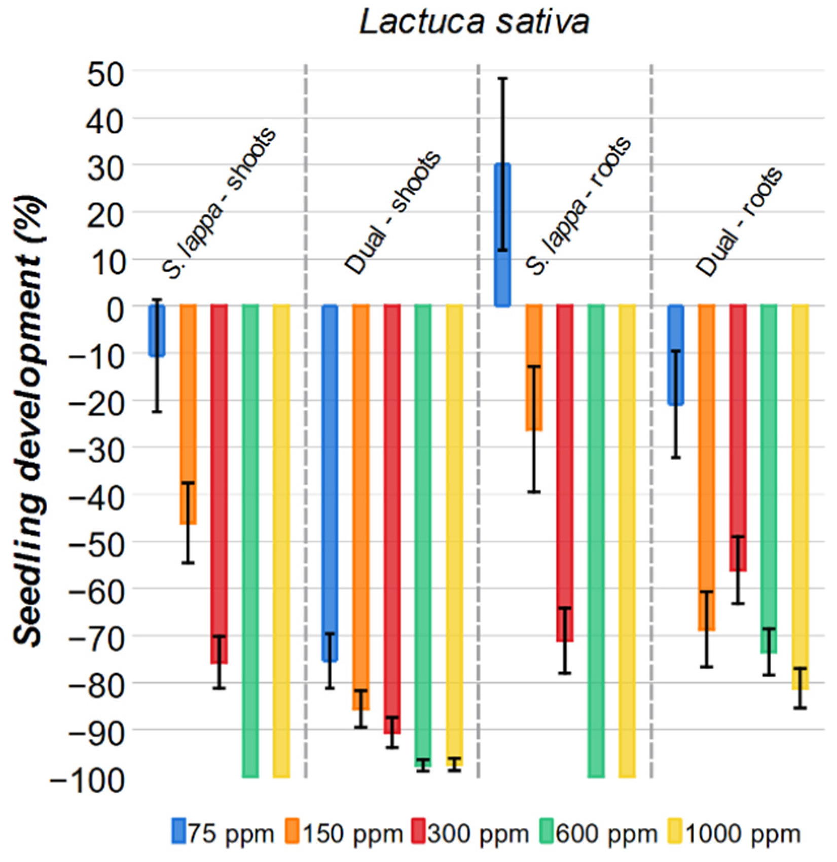 For the roots of lettuce, a biphasic effect was observed. The 75 ppm solution of S. lappa stimulates root growth by 30%, but at all higher concentrations, only inhibition was observed. Notably, when compared with Dual, the S. lappa extract at 300 ppm, 600 ppm, and 1000 ppm shows a greater inhibitory (15–25%) effect on the roots than Dual.