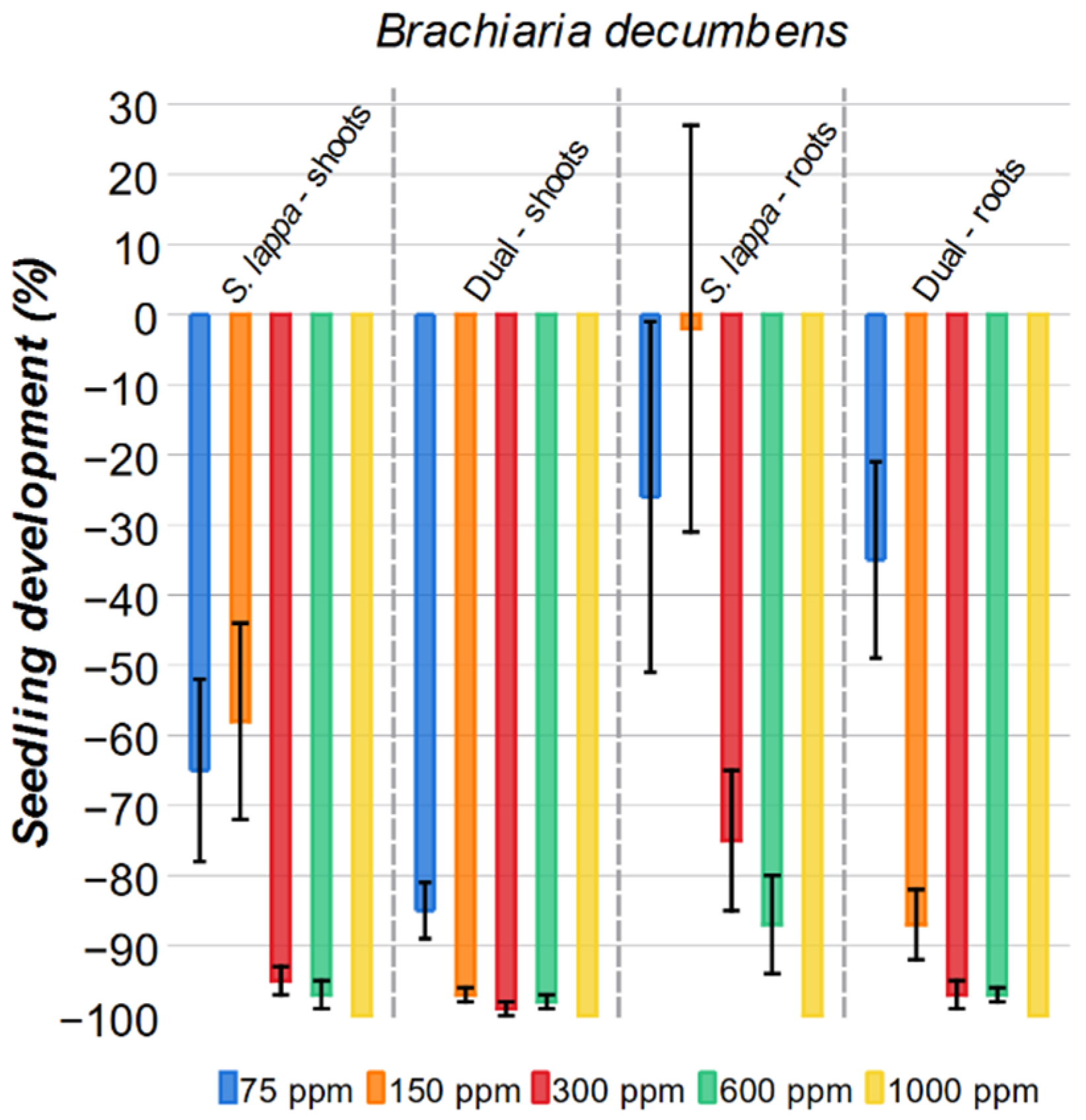 A similar biphasic effect was also present for the root of Bidens pilosa, with the 75 ppm solution stimulating root growth by 51%. As with the shoots, increasing concentration led to a more robust inhibitory effect on the roots. The commercial herbicide was more effective at 150 ppm and 300 ppm (59% and 66% inhibition, respectively) than the S. lappa solutions of the same concentration (36% and 35%, respectively). The 600 ppm S. lappa solution had a similar inhibition result (72%) to Dual (75%). However, the 1000 ppm solution (96%) was more inhibitory than the commercial herbicide (87%).