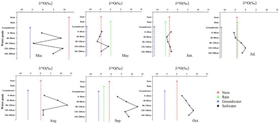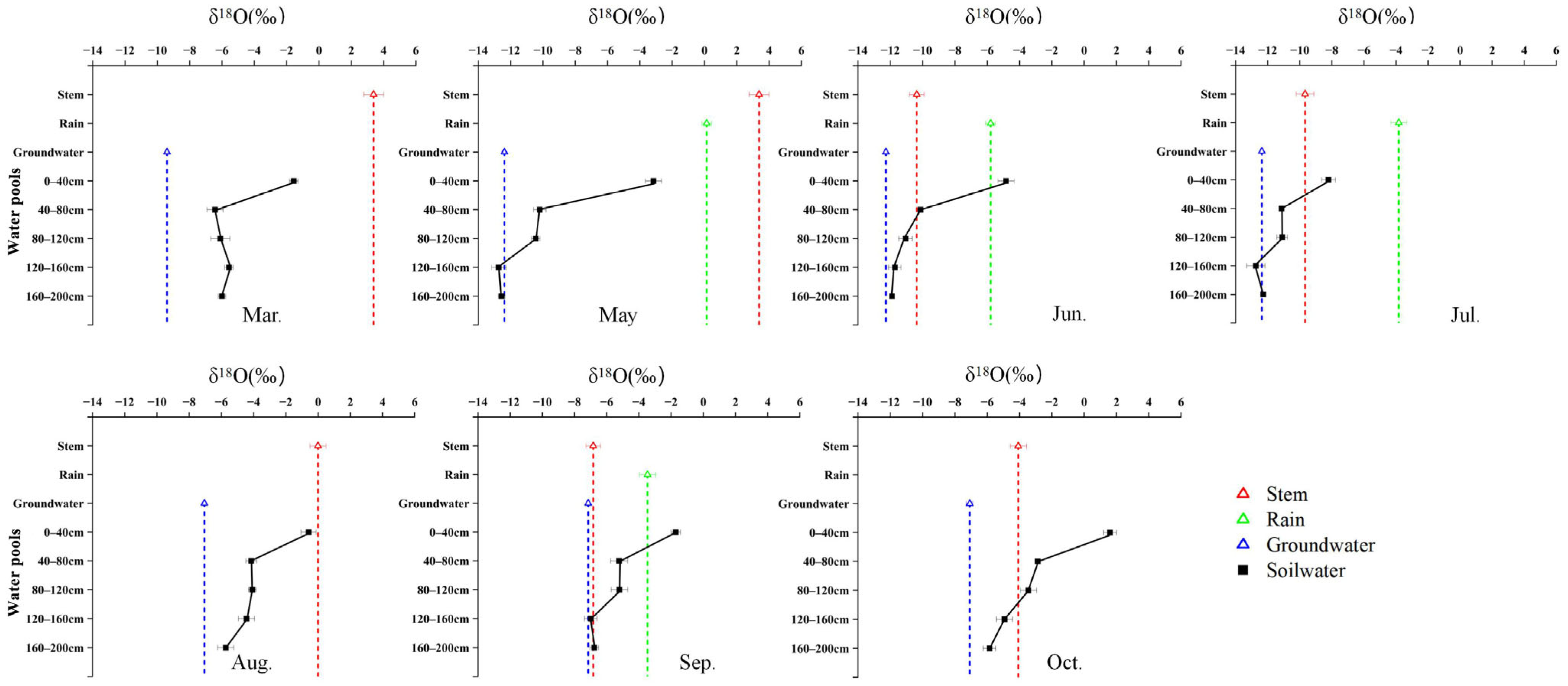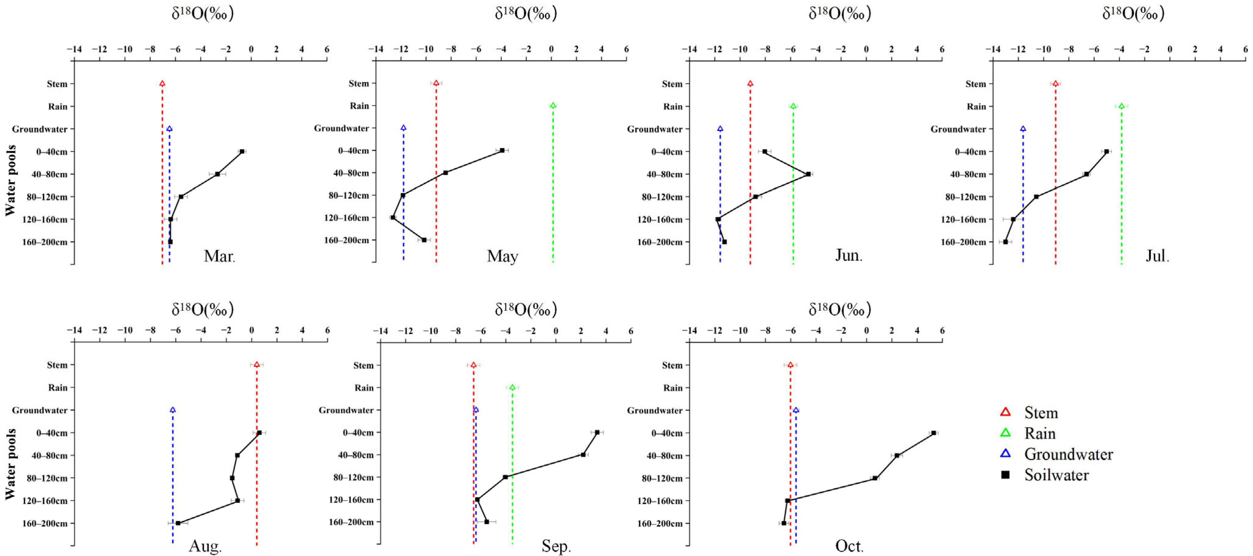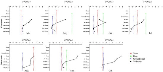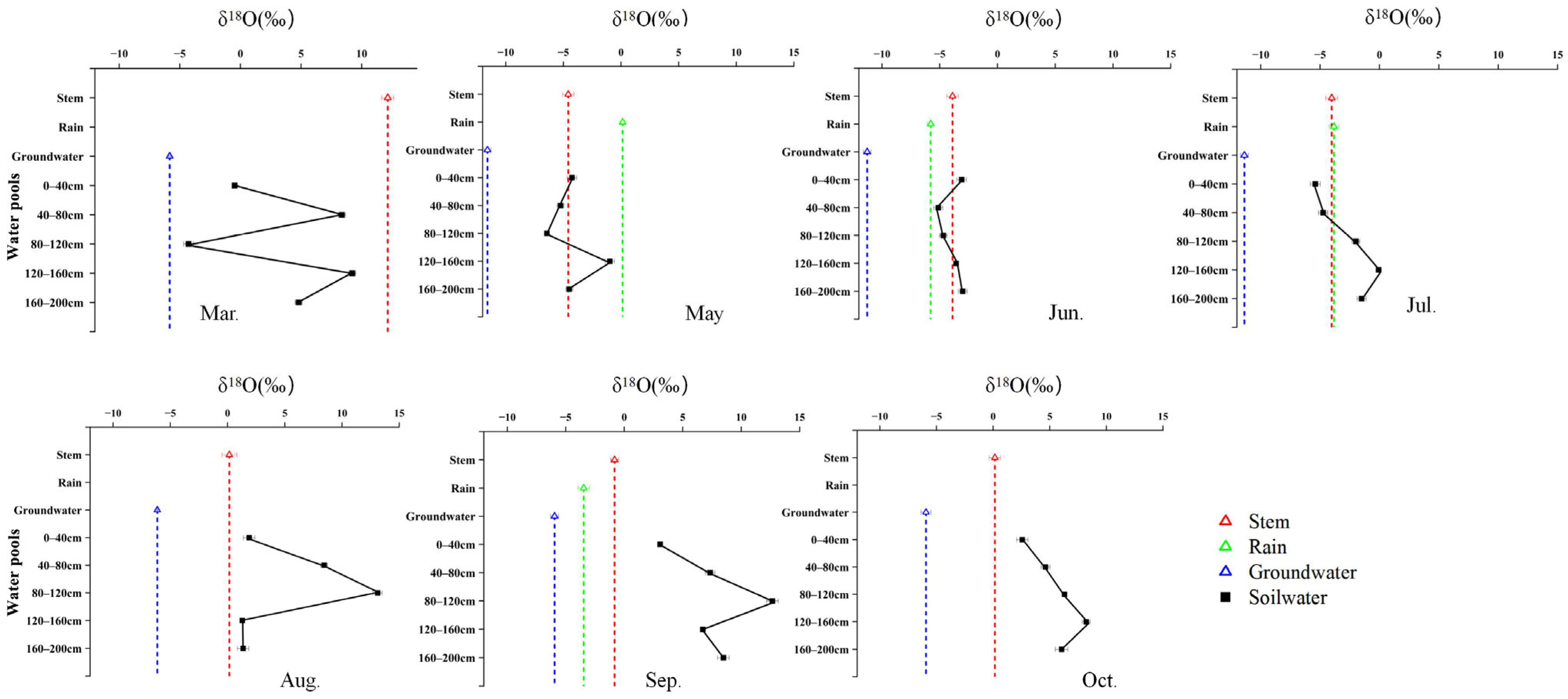 - Allen, S.T.; Kirchner, J.W.; Braun, S.; Siegwolf, R.T.W.; Goldsmith, G.R. Seasonal origins of soil water used by trees. Hydrol. Earth Syst. Sci. 2019, 23, 1199–1210. [Google Scholar] [CrossRef]