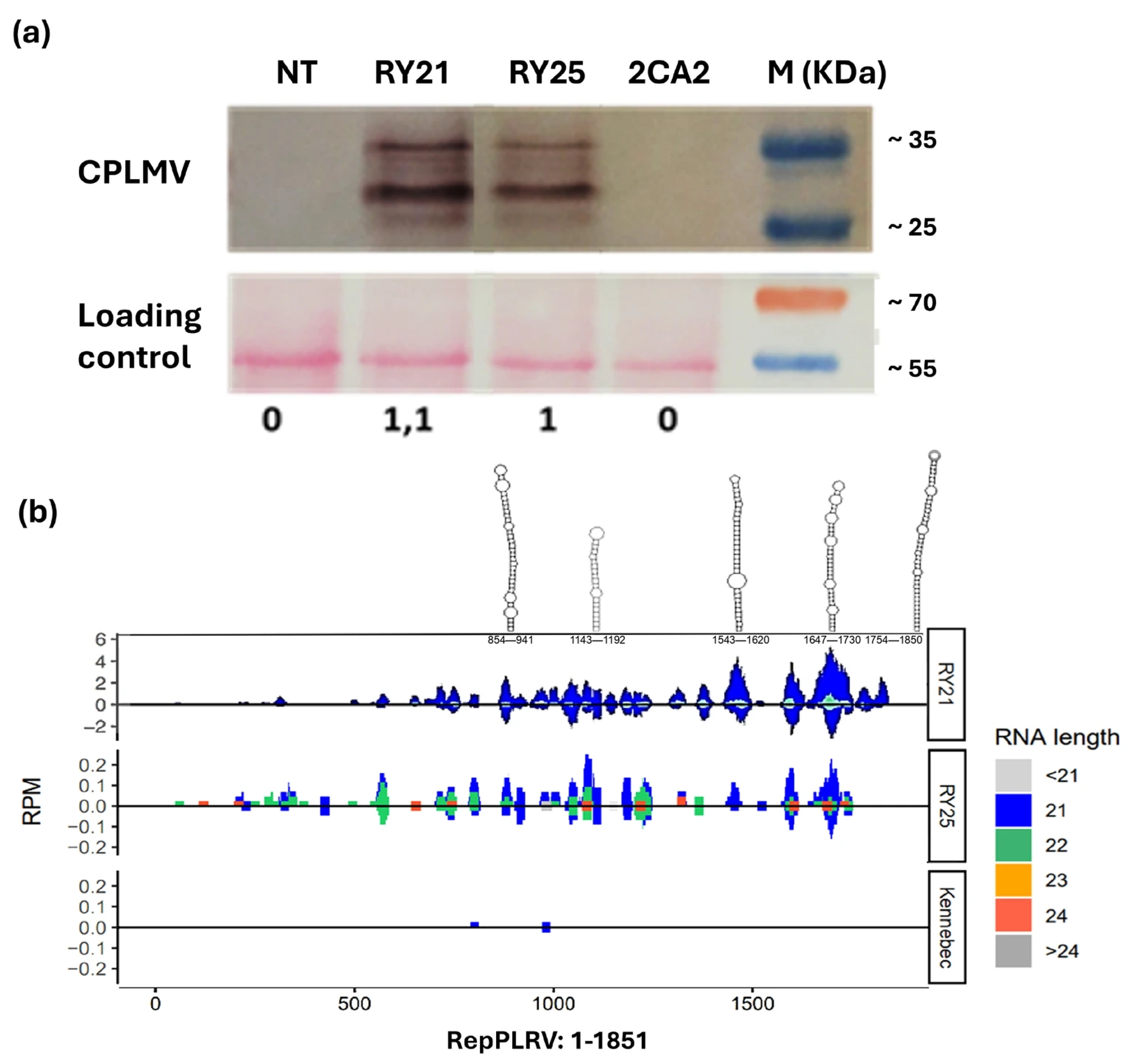 29] reported that the presence of CPLMV protein is essential for achieving PVY resistance in transgenic tobacco and potato plants, respectively. In line with these findings, the detection of CPLMV protein in our potato lines supports the hypothesis that the strong resistance to PVY observed in lines RY21 and RY25 is mediated by this protein. Moreover, small RNA sequencing analysis revealed a very low number of sRNAs derived from the CPLMV coding sequence (fewer than 30 reads). This suggests that the observed resistance is unlikely to involve RNA silencing mechanisms directed against the viral coat protein RNA. Mechanical inoculation of potato plants with PVY can lead to systemic infection; however, PLRV requires transmission by aphids or grafting to establish systemic infection. Therefore, under controlled greenhouse conditions, we could only evaluate resistance through direct inoculation with PVY. The transgenic lines RY21 and RY25 showed resistance under high infection pressure from mechanical inoculation, whereas control plants consistently exhibited high levels of PVY infection.