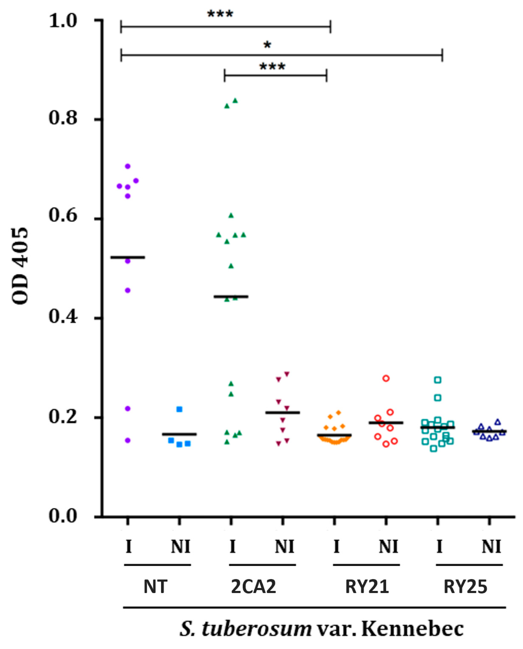 PVY infection trials were conducted under biosafety greenhouse conditions. Two-week-old in vitro-grown plants were transplanted into 5 L pots with soil and acclimatized for 3 weeks. The N used was variable for non-infected (NI) plants (4 NT and 8 for transgenic lines) and for infected (I) plants (10 NT and 16 for transgenic lines). NT and 2CA2 plants were used as controls.