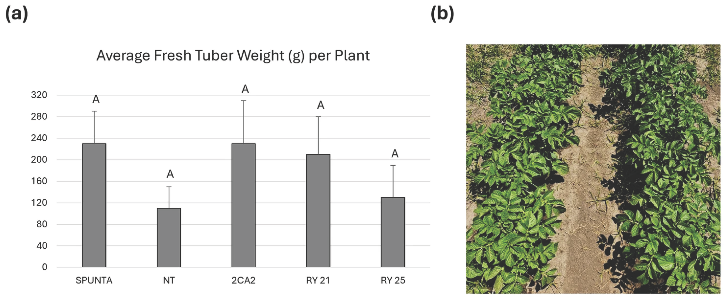2 was planted for each of the transgenic lines or with non-transgenic (NT cv. Kennebec or Spunta) tubers. Average fresh tuber weight obtained (in grams (g)) calculated from the mean value (total tuber weight divided by total number of plants/tubers) of each block. The plots were fenced to avoid vandalism and to prevent access by large animals. Comparative field trials to evaluate the agronomical performance of RY lines were carried out during the growing seasons of 2005–2006 and 2015–2016 at Malargüe, Mendoza Province, which is a virus-free potato seed production region of Argentina. Three additional consecutive planting campaigns were carried out in a field in Buenos Aires Province, Argentina, between 2022 and 2024. Viral resistance evaluations under natural field exposure were performed in Tupungato, Mendoza Province (Argentina), which is a potato production region in which PVY and PLRV infection rates are normally high. These trials were carried out during two consecutive growing seasons (2015/2016 and 2016/2017). Regarding the PLRV strains circulating at the endemic site during that period, the detected isolate corresponded to the Argentinian strain of PLRV (PLRV-Ar; GenBank accession number KY856831). Furthermore, the PVY strain present in the Mendoza experimental field coincided with the one that had been previously identified by Barrios Barón as a recombinant NTN type isolate (recombinant PVYNTN) [