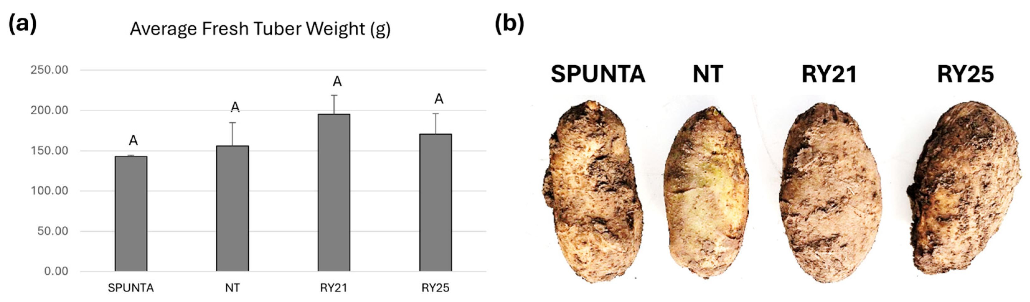 Assessment of tuber yield in the RY transgenic candidate lines under greenhouse conditions, performed over multiple years, demonstrates that expression of the RepPLRV and CPLMV transgenes does not affect plant productivity. Subsequent field trials confirmed that this conclusion could be extended to virus-free field conditions in Malargüe, Mendoza Province. Under field evaluations, the transgenic lines RY21 and RY25 also exhibited agronomic performance comparable to that of the non-transgenic Kennebec cultivar from which they were derived. No significant differences between the transgenic plants and the NT control plants in terms of growth, yield, and tuber shape were observed, indicating that RY lines retain the high levels of productivity and the characteristics of the original commercial cultivar. Moreover, these results were confirmed across three additional consecutive planting campaigns conducted in a field in Buenos Aires Province between 2022 and 2024.