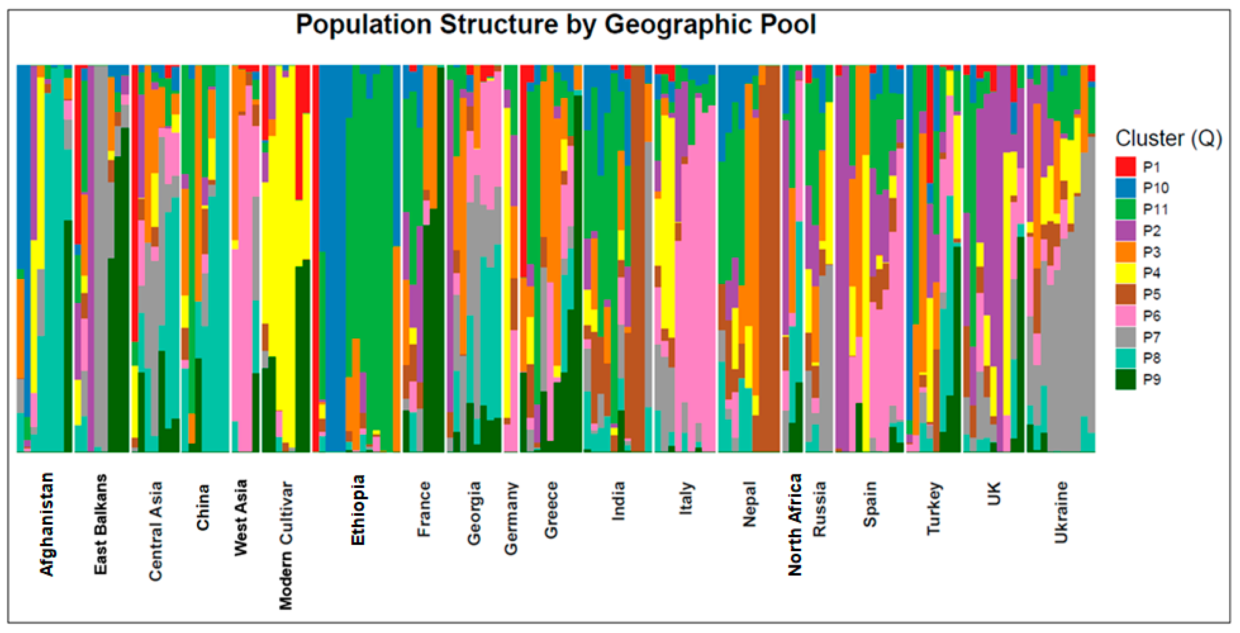 - Smýkal, P.; Kenicer, G.; Flavell, A.J.; Corander, J.; Kosterin, O.; Redden, R.J.; Ford, R.; Coyne, C.J.; Maxted, N.; Ambrose, M.J.; et al. Phylogeny, Phylogeography and Genetic Diversity of the Pisum Genus. Plant Genet. Resour. 2011, 9, 4–18. [Google Scholar] [CrossRef]