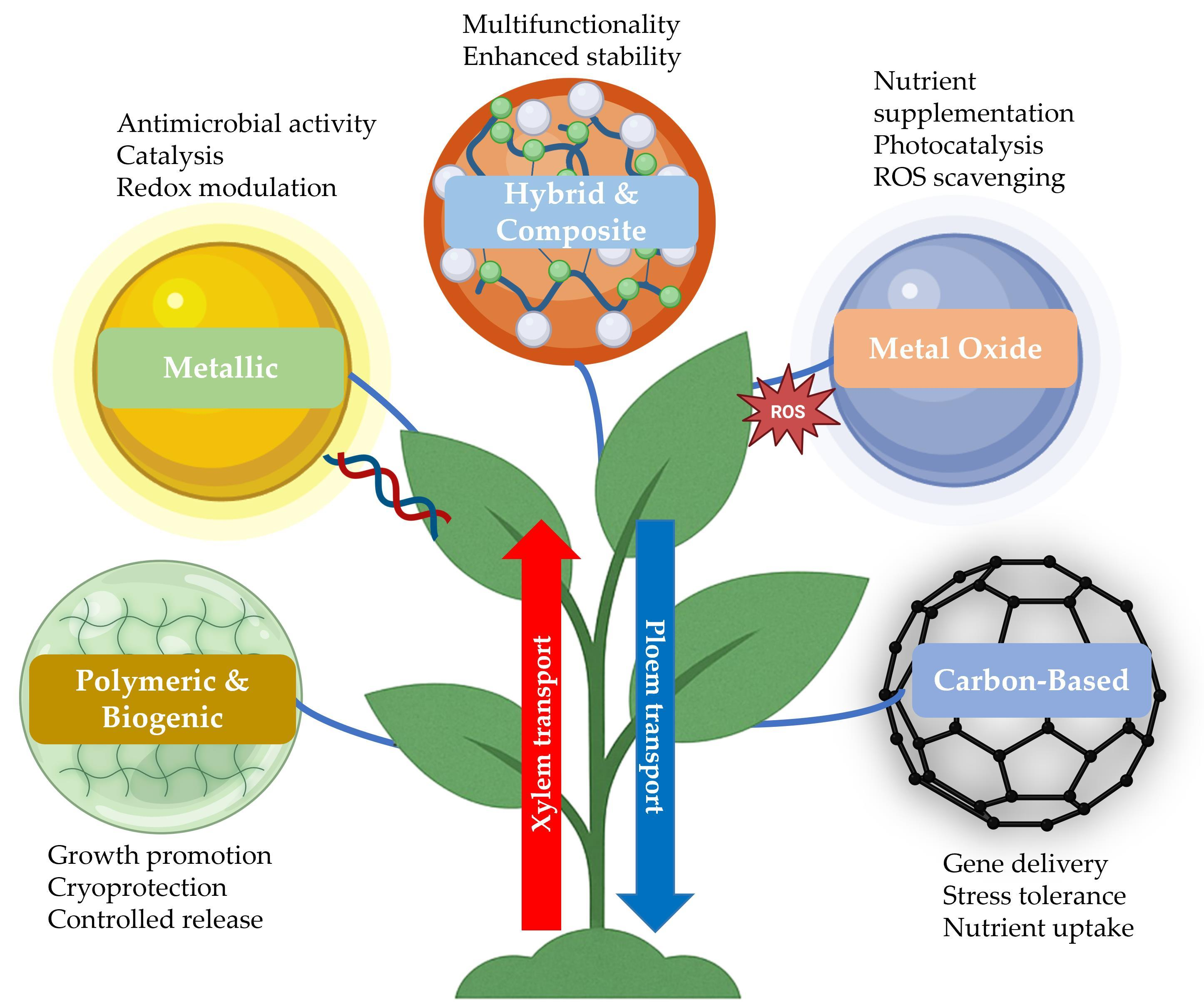 | NP Types | Representative Examples | Core Properties | Major Plant Applications | References |