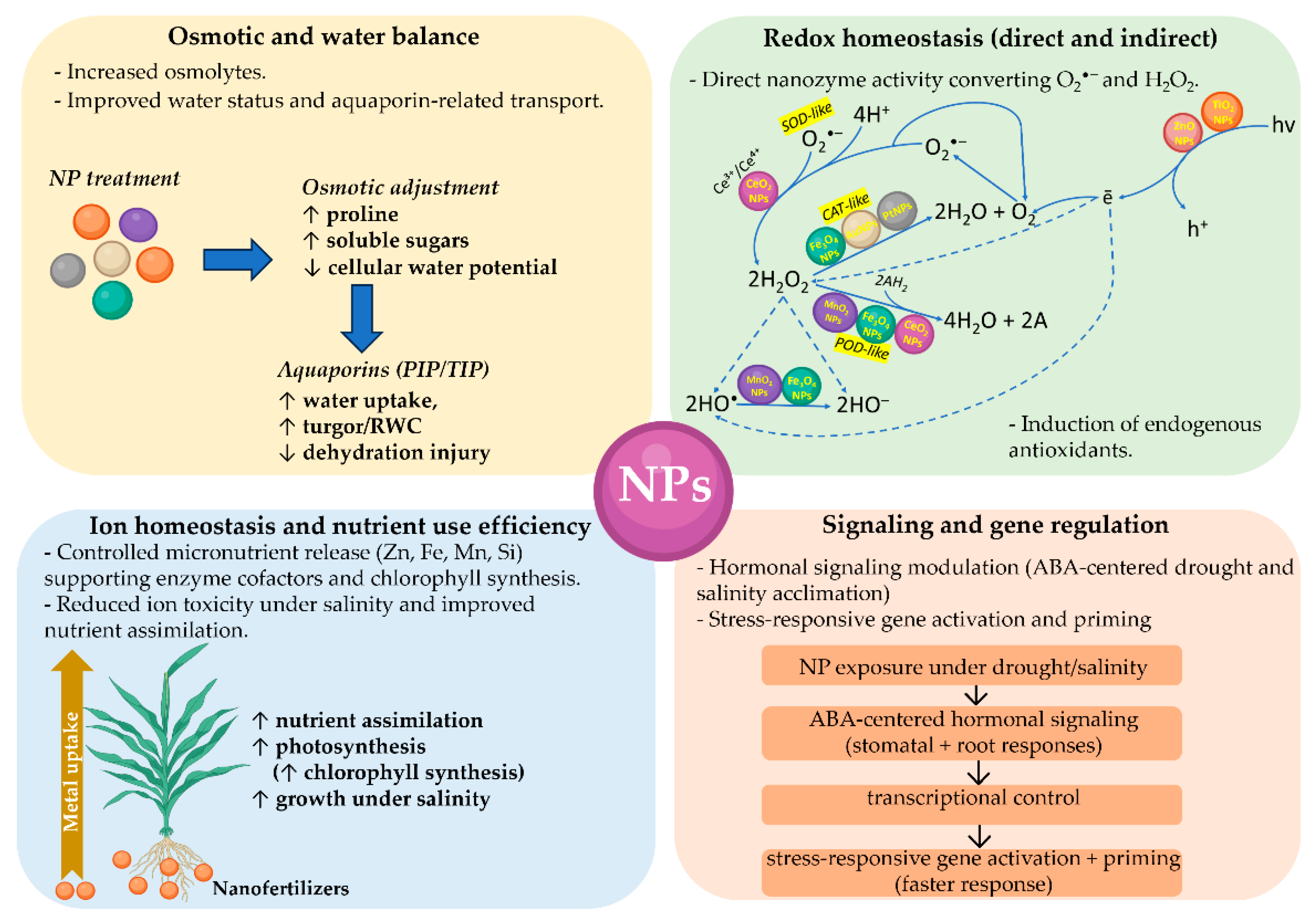 - Dilnawaz, F.; Misra, A.; Apostolova, E. Involvement of Nanoparticles in Mitigating Plant’s Abiotic Stress. Plant Stress 2023, 10, 100280. [Google Scholar] [CrossRef]