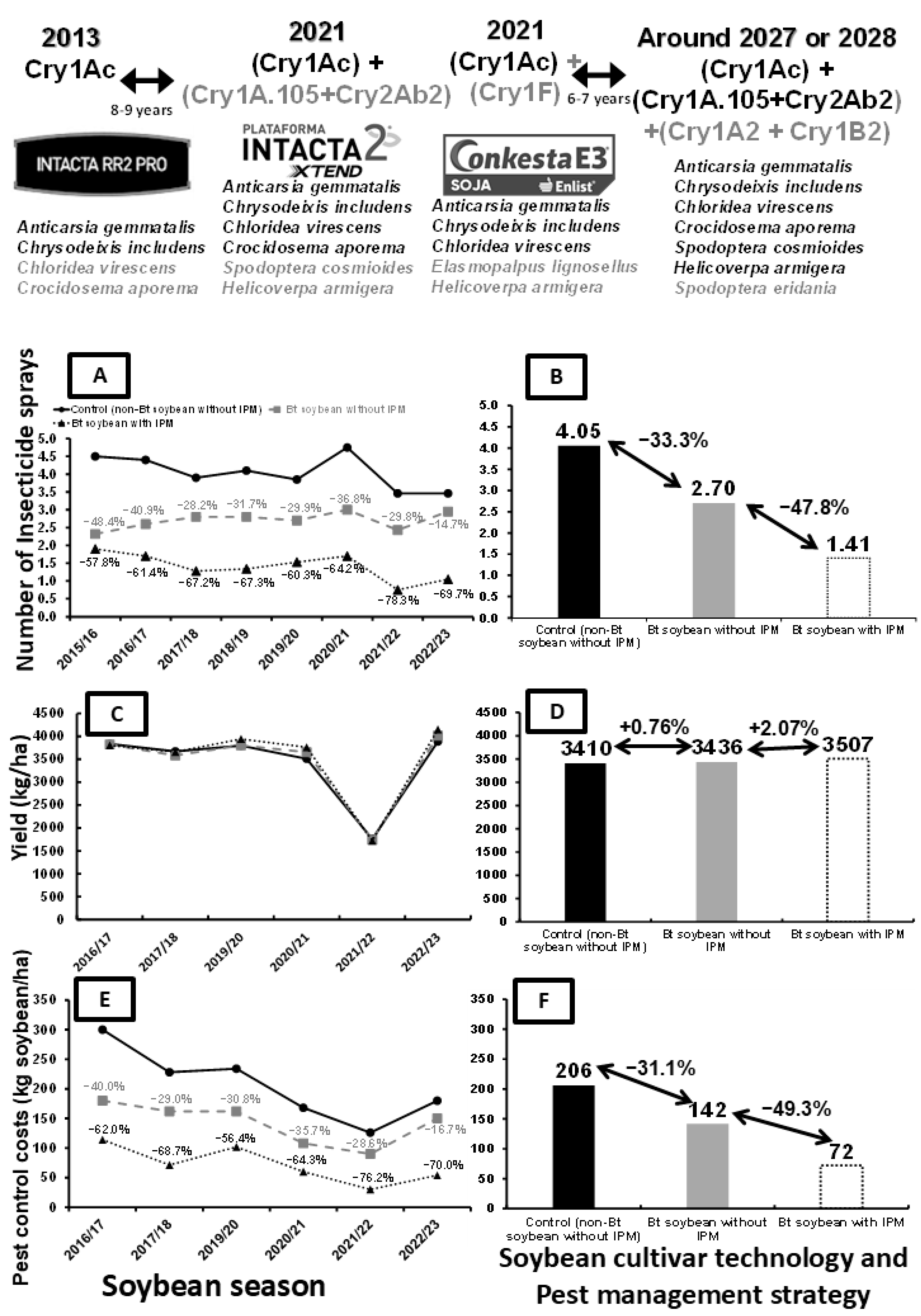 - Bueno, A.F.; Braz-Zini, E.C.; Horikoshi, R.J.; Bernardi, O.; Andrade, G.; Sutil, W.P. Over 10 years of Bt soybean in Brazil: Lessons, benefits, and challenges for its use in Integrated Pest Management (IPM). Neotrop. Entomol. 2025, 54, 1–12. [Google Scholar] [CrossRef] [PubMed]