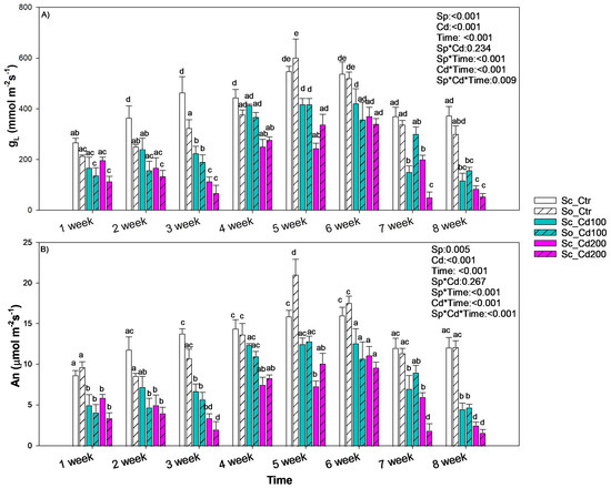 Mean ± SD of (A) stomatal conductance to water vapor (gL) and (B) photosynthesis rate (An) recorded in Salvia ceratophylloides (Sc) and Salvia officinalis (So) plants grown in good-quality soil (Ctr) or in the same soil contaminated with two concentrations of cadmium (Cd100 and Cd200). Different letters indicate significant differences between means (p < 0.05) based on three-way ANOVA followed by Holm–Sidak post hoc test. Reported p values refer to the effects of species (Sp), cadmium concentration (Cd), time of exposure (Time) and their interaction (Sp*Cd; Sp*Time; Cd*Time, Sp*Cd*Time). * denotes interaction between factors.