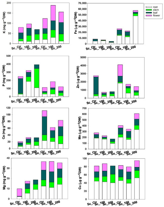 Values of concentration of macronutrients (K, P, Ca, Mg) and micronutrients (Fe, Zn, Mn, Cu) across different plant organs (root, stem, leaf, flower) measured in Salvia ceratophylloides (Sc) and Salvia officinalis (So) plants grown in good-quality soil (Ctr) or in the same soil contaminated with two concentrations of cadmium (Cd100 and Cd200).