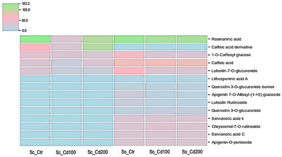 Heat map of phenolic compound variation measured in Salvia ceratophylloides (Sc) and Salvia officinalis (So) plants grown in good-quality soil (Ctr) or in the same soil contaminated with two concentrations of cadmium (Cd100 and Cd200). Concentration increases from blue to green, according to the color scale.