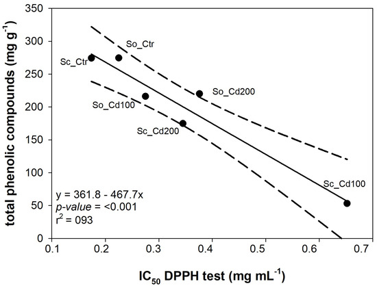 Relationship between the total amount of phenolic compounds detected by HPLC-PDA/ESI-MS analysis and the concentration of extract required to scavenge 50% of DPPH free radicals (IC50 DPPH test) measured in Salvia ceratophylloides (Sc) and Salvia officinalis (So) grown under control (Ctr) or cadmium-contaminated soil (Cd100, Cd200). Linear regression and 95% confidence interval are shown by the solid line and dotted lines, respectively. The equations of the fitted linear regression and the corresponding p-value and R2; value are reported.