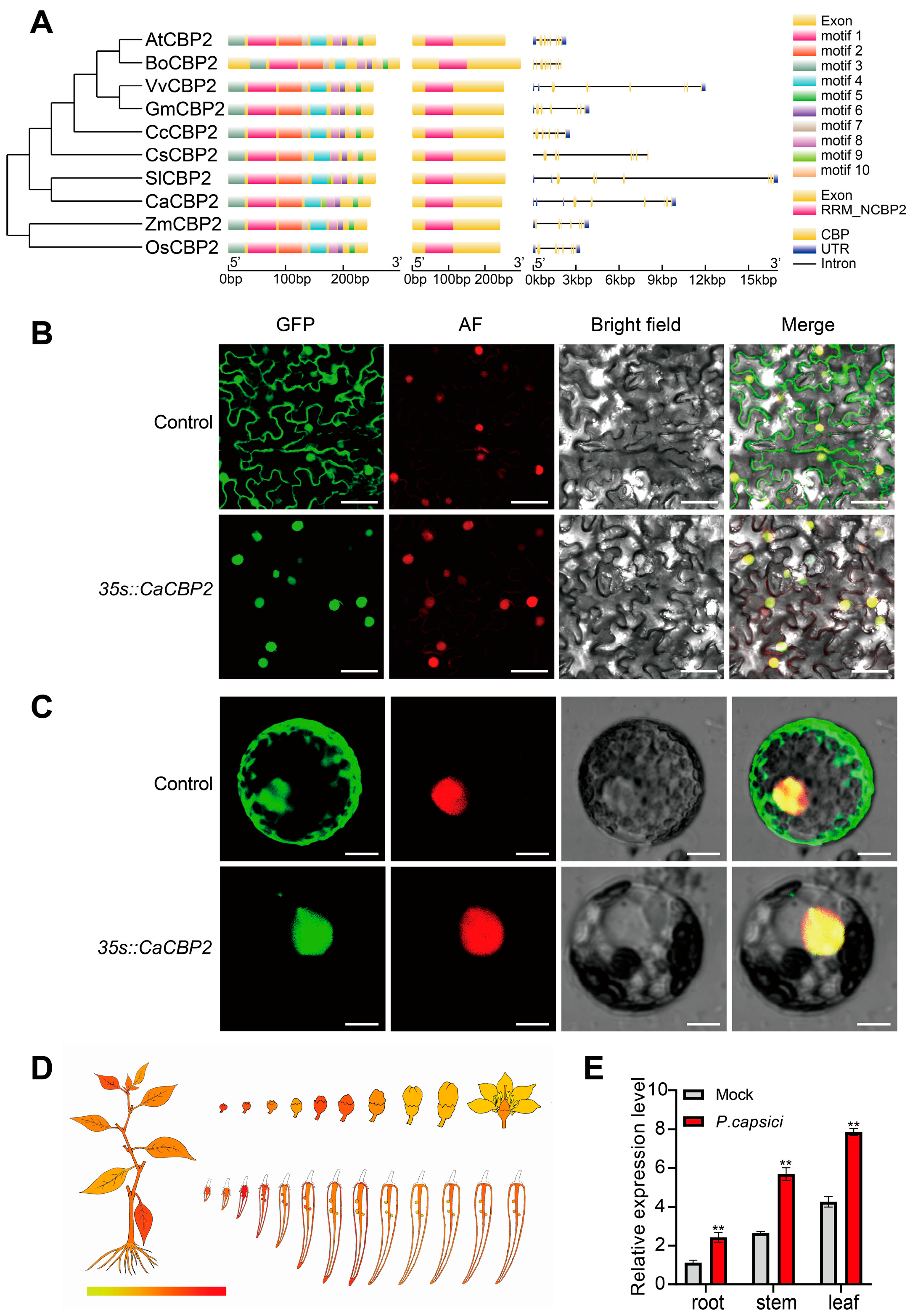 2.1. Gene Structure, Subcellular Localization, and P. capsici-Induced Expression Characteristics of CaCBP2