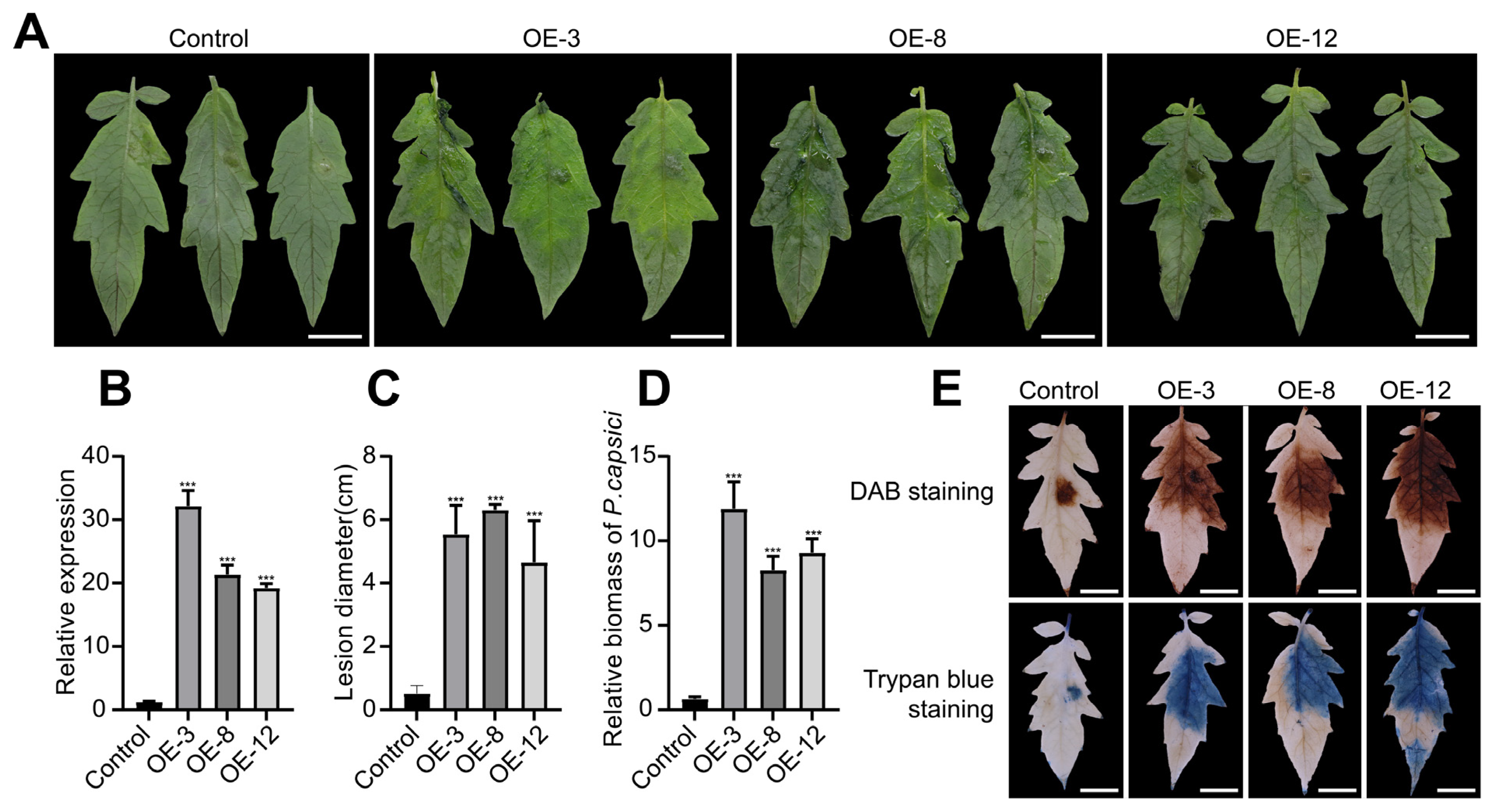 2.4. Stable Overexpression of CaCBP2 in Tomato Enhances Susceptibility to P. capsici