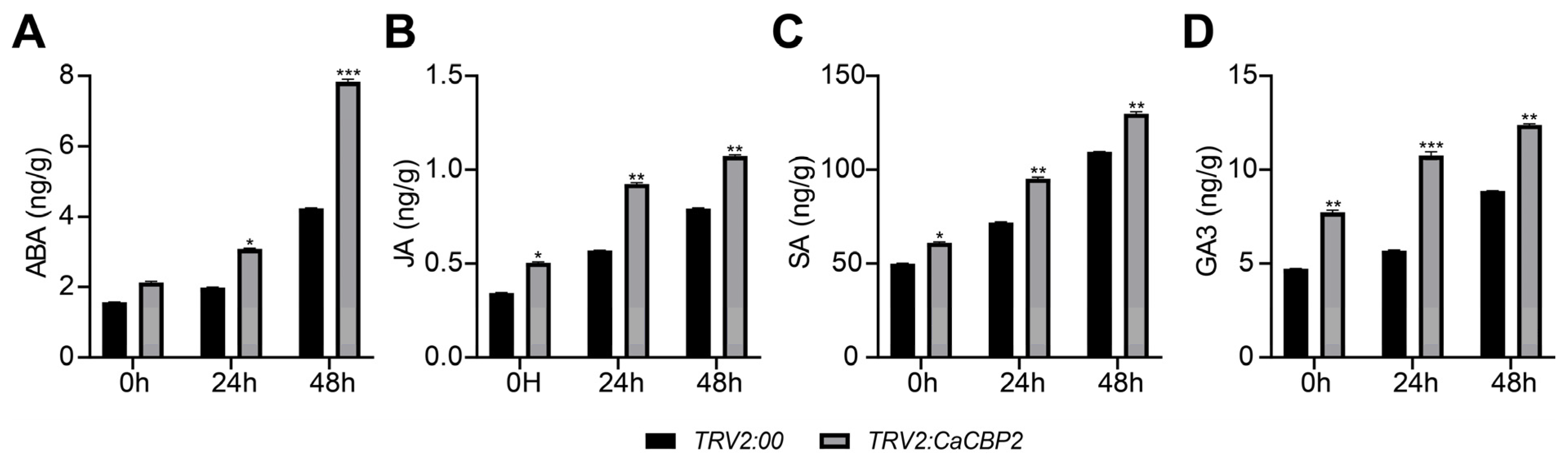 2.6. Silencing CaCBP2 Increases the Content of Key Hormones Under P. capsici Stress