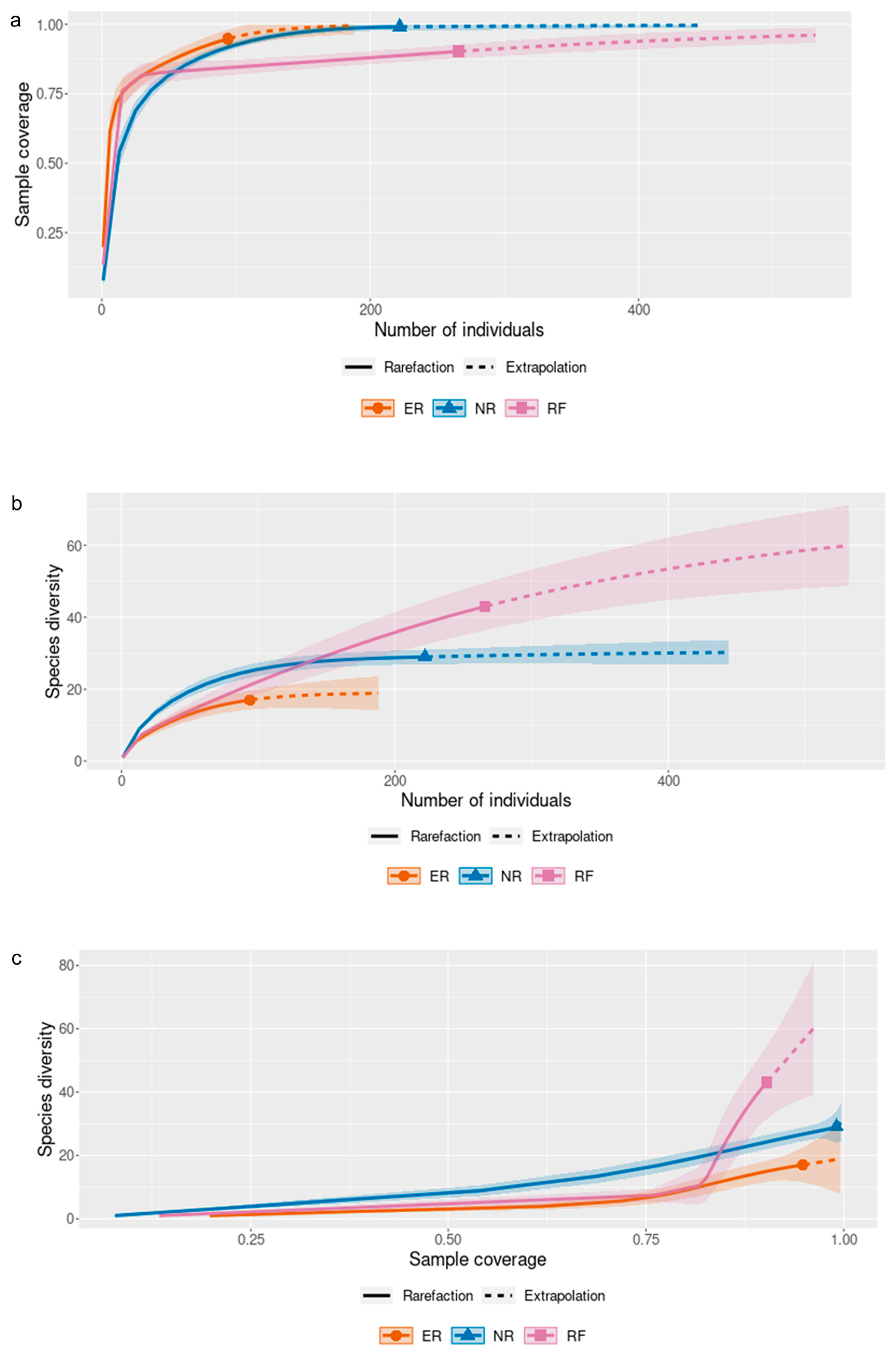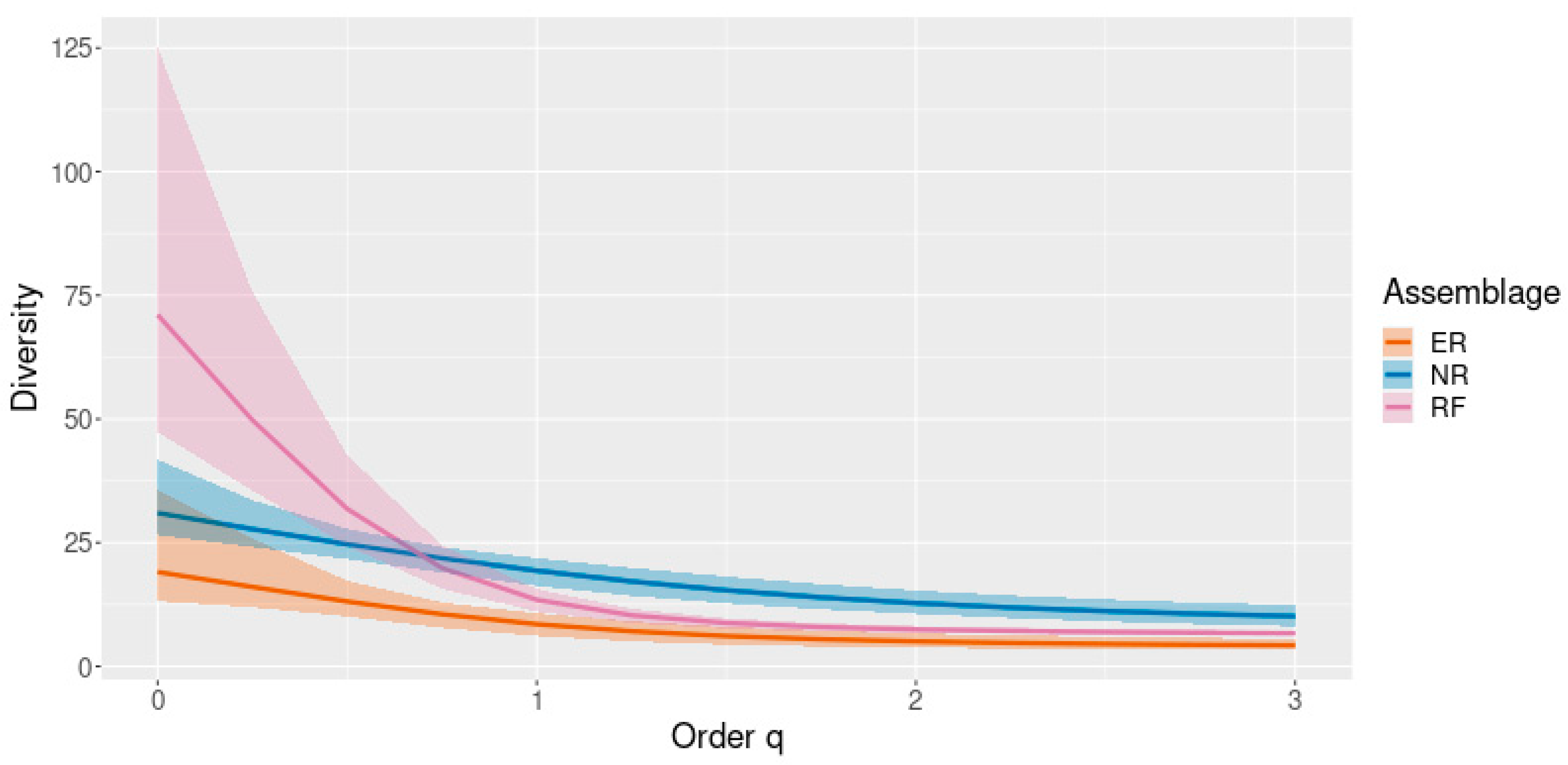 - Chao, A.; Gotelli, N.J.; Hsieh, T.C.; Sander, E.L.; Ma, K.H.; Colwell, R.K.; Ellison, A.M. Rarefaction and Extrapolation with Hill Numbers: A Framework for Sampling and Estimation in Species Diversity Studies. Ecol. Monogr. 2014, 84, 45–67. [Google Scholar] [CrossRef]
