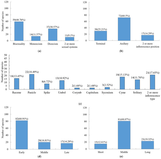In terms of sexual systems (Figure 3a), hermaphroditic flowers dominated (48.76%), followed by dioecious species (30.57%). For inflorescences (Figure 3b,c), the position was primarily axillary, with panicles (18.49%), cymes (15.13%), racemes (13.45%), solitary flowers (11.76%), and umbels (10.92%) being the most common types. Regarding phenological observations (Figure 3d), most species exhibited early flowering, with 68.91% initiating flowering in the early growing season. Flowering duration (Figure 3e) was generally moderate across species.