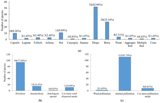 Fruit type, seed dispersal and pollination modes of woody plants. (a) Fruit type; (b) seed dispersal mode; (c) pollination mode.