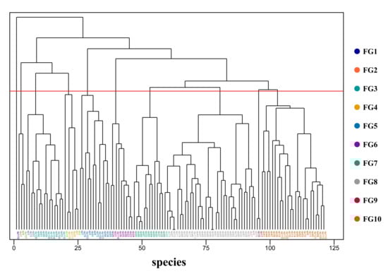 Dendrogram from the hierarchical clustering of 121 woody plant species based on 17 functional traits. Different colors represent the 10 identified functional groups, and the red line indicates the clustering threshold.
