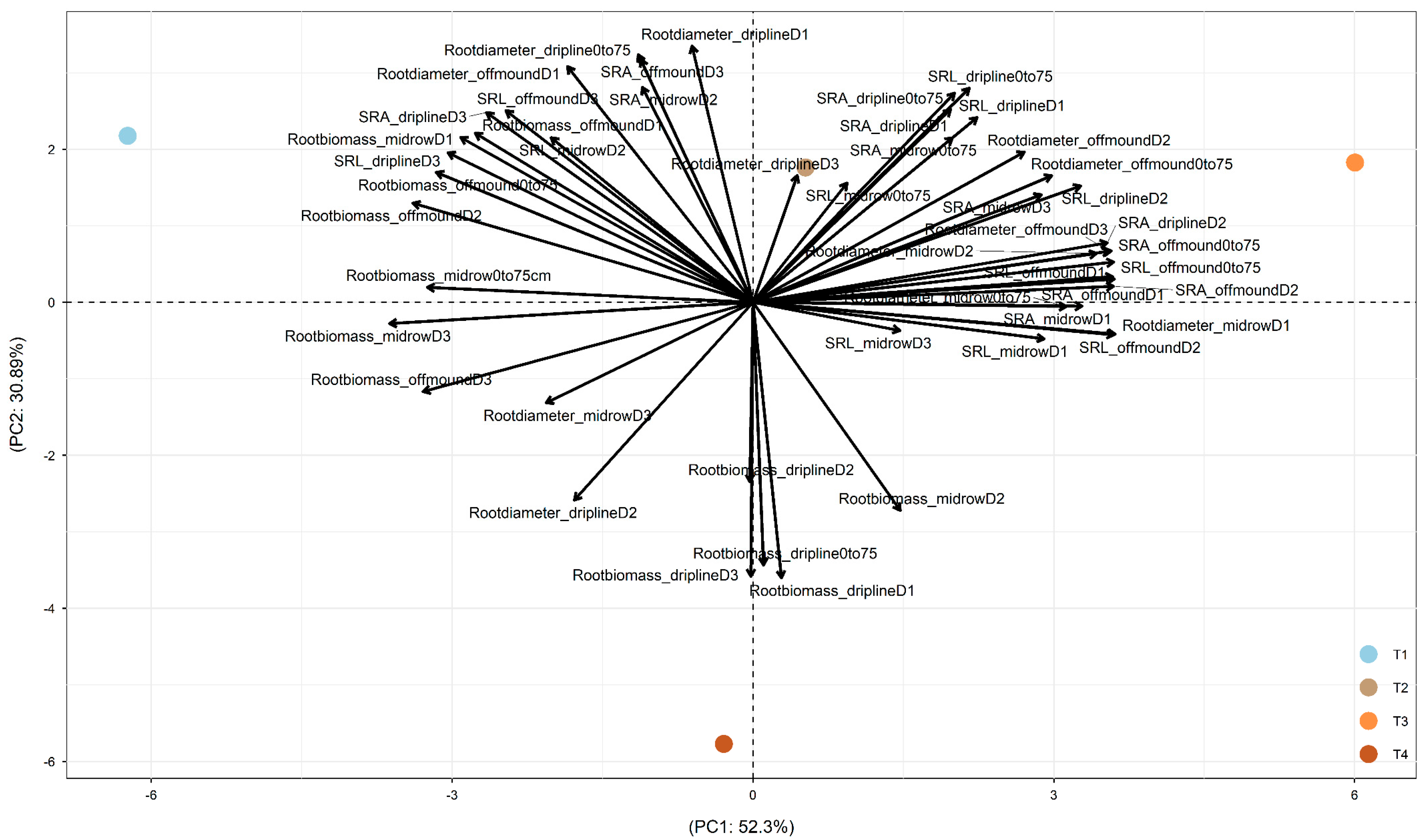 Figure 4). PC2 was driven by the difference between −W−N (in the top part) and the other three treatments (in the bottom part). +W−N led to root adjustments in deeper soil and more distant soil through (1) increased root biomass at driplines D2 and D3; off-mound D1, D2, and D3; and mid-row D1, D2, and D3; (2) increased root diameter at dripline D1 and off-mound D1 and D3; and (3) increased SRA and SRL at off-mound D1 and D2 and mid-row D1, D2, and D3 (
