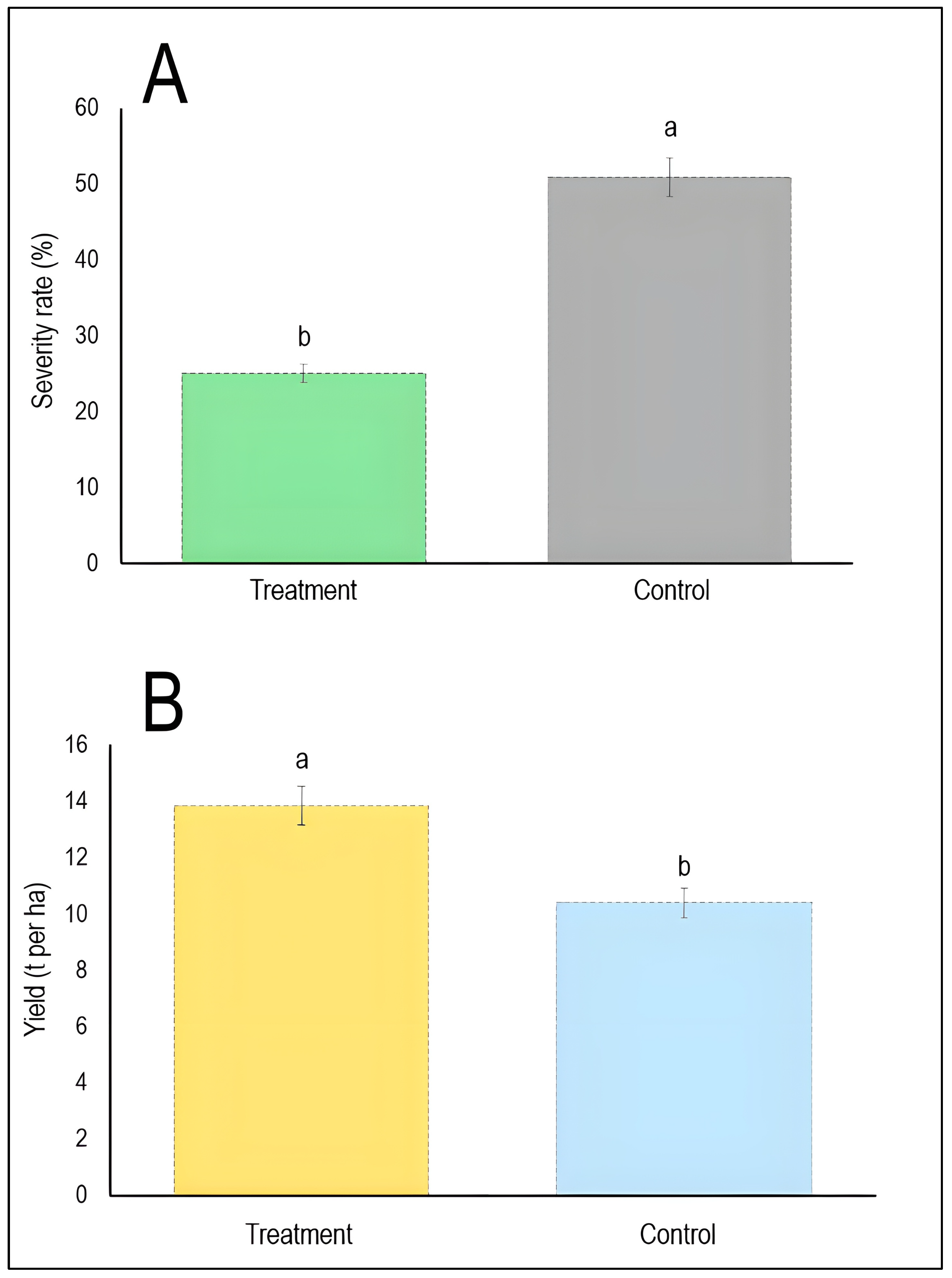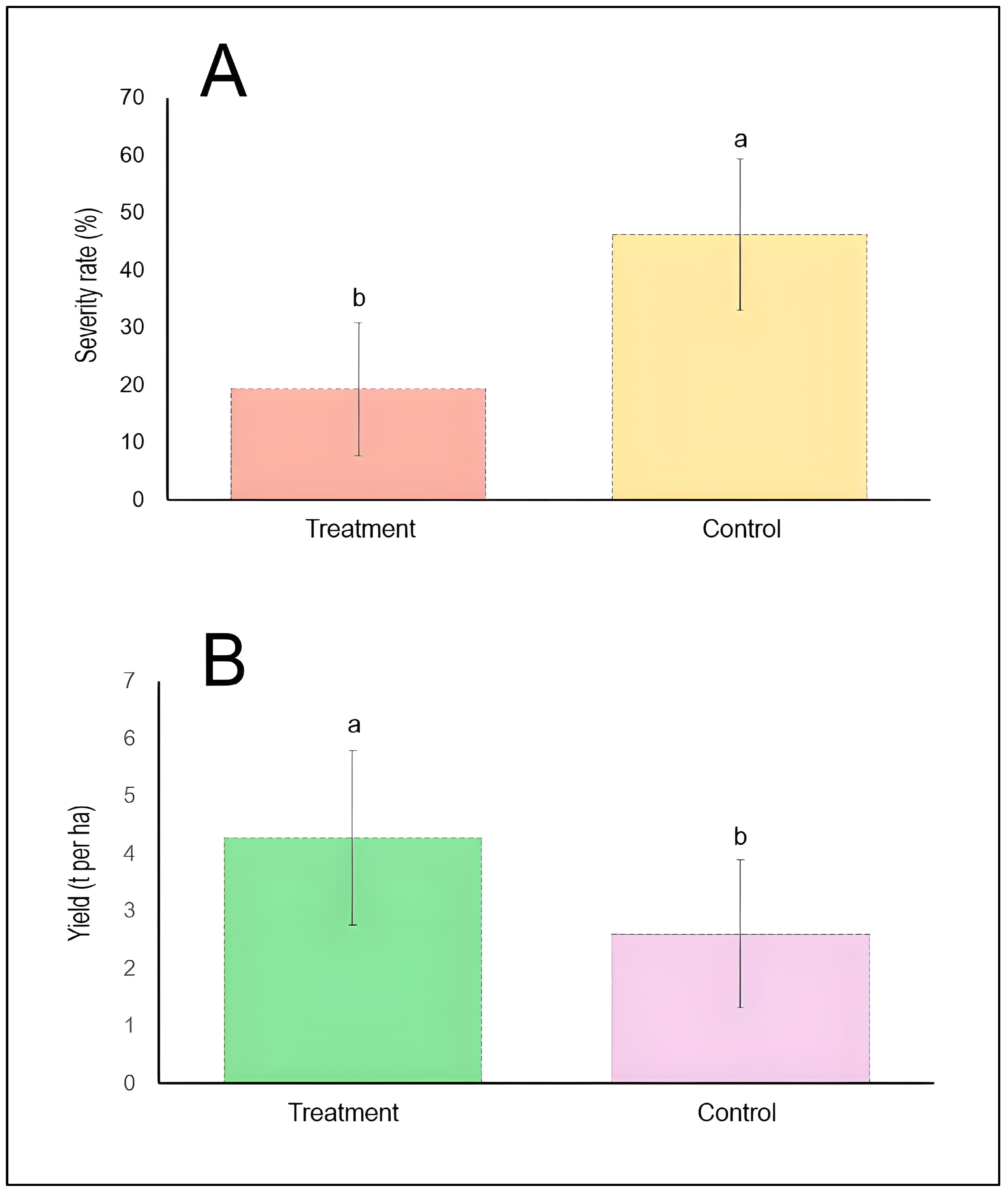 2.2.1. Effect of Biological Control on Stripe Rust Disease Severity and Yield