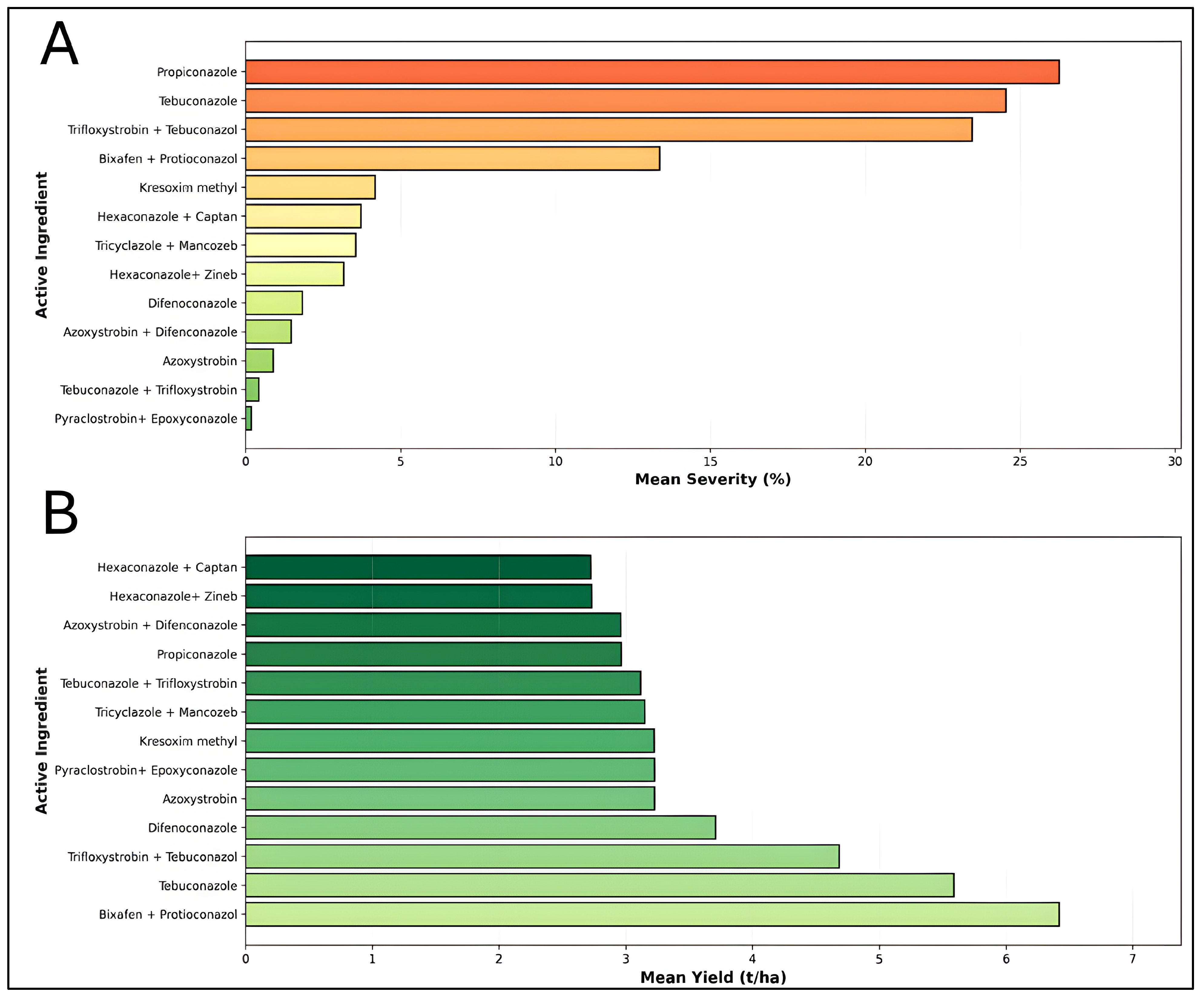 | Bixafen + Propiconazole | C2 + G1 | SDHI + DMI (SBIs) | 7 + 3 | 1 | GS34 (jointing) | [12] |