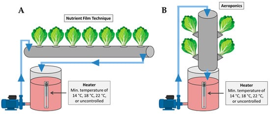 Soilless (hydroponic) cultivation of lettuce nowadays is gaining increasing attention. The cultivation of leafy vegetables in hydroponic systems is considered one of the most efficient strategies of intensive food production employed in confined environments (i.e., greenhouses and vertical farms) under controlled conditions. Due to the increasing demand for fresh, safe, high-quality food, soilless production systems are crucial for the future of agriculture, especially in regions with limited water and land availability and high urbanization [6]. Within hydroponic production, the potential of precise root-environment control offers substantial benefits over traditional soil agriculture, which shows significant nutrient losses and an inadequate ecological footprint. Among the various soilless systems, the nutrient film technique (NFT) and aeroponics allow for precise control of the root zone environment, high water- and nutrient-use efficiency, and an enhanced overall capacity for cultivation under relatively controlled conditions [6]. Briefly, in the NFT, a thin layer of nutrient solution flows through a horizontal canal where the root system directly receives water and nutrients [7]. Aeroponics can be described as a soilless system where roots are exposed in a tube (usually vertically placed) and periodically moisturized with nutrient solution [8]. Both systems vary considerably with respect to the environment where the root system is exposed. The discrepancies between soilless systems emphasizes the need for targeted management strategies depending on the cultural characteristics of each system. Moreover, soilless cultivation is considered a tool critical to achieving the Sustainable Development Goals established by the United Nations, involving the cultivation of traditional or underutilized leafy vegetables [9], as well as the implementation of organically produced compounds such as biostimulants and liquid digestates, among others [10,11]. The success of soilless cultivation largely relies on the stability of critical parameters such as root-zone temperature and air temperature [12].