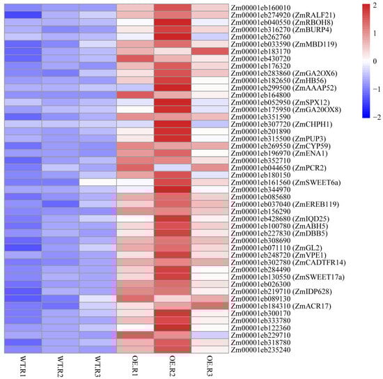 Heat-map of RNA-seq log2-fold changes for the 48 directly activated ZmNAC20 targets. Each row represents one gene; color scale (right) ranges from blue (repressed) to red (induced). Genes discussed in the text are labeled with their symbol names from maizeGDB database (accessed on 31 December 2025). Genes lacking the symbol in MaizeGDB are shown without annotation because no curated description is currently available.