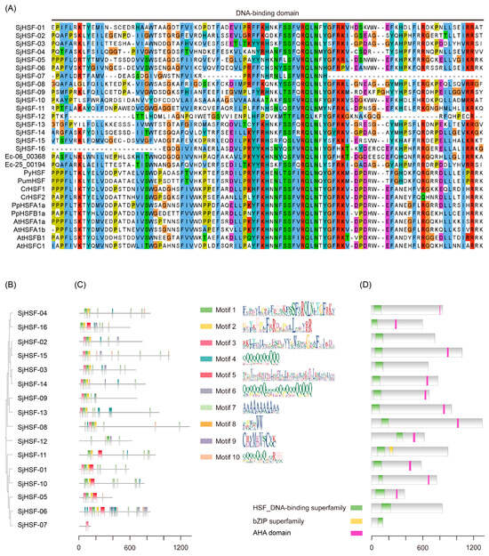 To characterize the structural features of SjHSFs, we analyzed their conserved motifs and domains (Figure 1B–D). Ten distinct motifs were identified across all SjHSFs (Figure 1C), and the motif combinations can be grouped as three categories (Figure 1B,C). The first category all contained motif 1, motif 2 and motif 3, which correspond to DBD, including SjHSF-02, -03, -08, -09, -13, -14, and -15. The second category (SjHSF-01, -05, -06, -07, -10, -11, and -16) primarily featured motif 3 or motif 5, especially, SjHSF-07 retained only one motif. The third category comprised only SjHSF-12. All SjHSFs harbored HSF DNA-binding superfamily domain (Figure 1D). Notably, SjHSF-11 encodes an additional basic leucine zipper (bZIP) domain (Figure 1D). Furthermore, eleven SjHSFs contained the AHA motif, a defining feature of HSFA (Figure 1D, Table S2). However, there is no specific HR-A/B region characteristics in SjHSFs (Figure S1). It is only possible to vaguely discern the boundary of HR-A within SjHSFs, while the characteristic features of HR-B are absent (Figure S1).