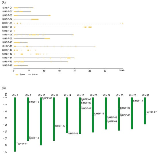 The exon/intron structure of SjHSFs was determined by aligning the genomic sequence against the corresponding CDS. With the exception of SjHSF-07, most SjHSFs contained introns. The number of exons per SjHSF gene ranged from one to twelve (Figure 2A): SjHSF-03, -04, and -09 each contained a single intron; SjHSF-01 and -02 each contained two introns; SjHSF-05, -10, and -16 each contained four introns; and SjHSF-11 had a maximum of twelve. The chromosomal locations of SjHSFs were confirmed using genome annotation data [23,24]. The 16 SjHSFs were mapped to chromosomes, with an uneven distribution (Figure 2B). Chromosomes 3, 10, 11, 14, 20, 28, and 32 each had only one gene, while chromosomes 6, 24, and 25 contained two and three genes, respectively. Three SjHSFs were distributed on chromosome 16.