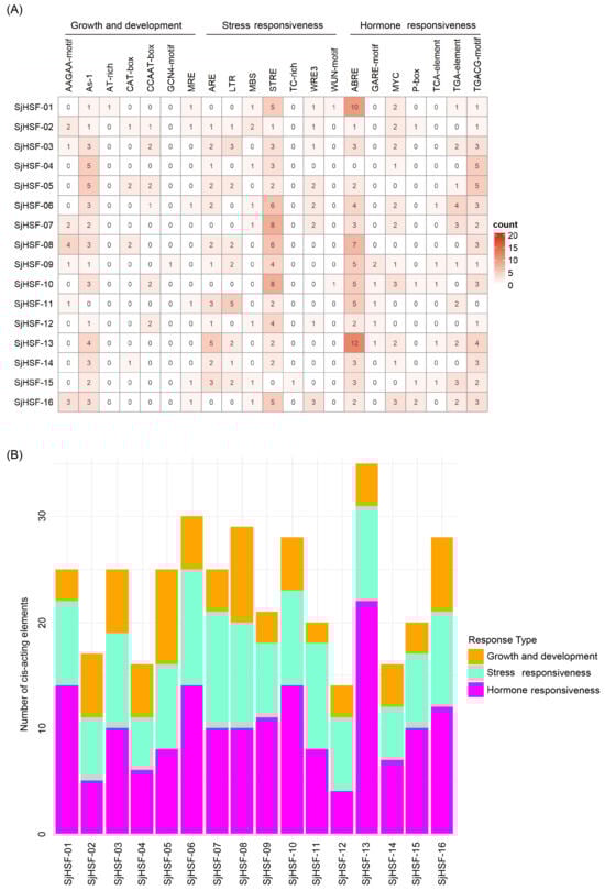 Summary of plant development, stress-inducible, and phytohormone cis-acting elements in the promoter regions of SjHSF genes. (A) The number of cis-acting elements in promoter regions of SjHSF genes. (B) The number of cis-acting elements in each category.
