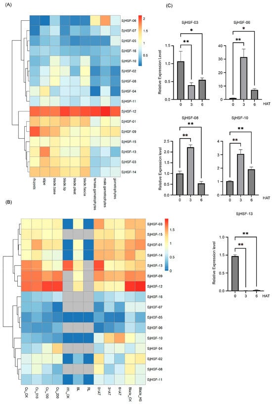 To explore the function of the SjHSF genes in S. japonica growth and development, tissue-specific expression levels were retrieved from public transcriptome data, covering rhizoids, stipes, blade bases, blade tips, blade pleats, blade fasciae, female gametophytes, and male gametophytes. All 16 SjHSFs exhibited variable expression across tissues (Figure 5A and Table S4). Specifically, seven genes (SjHSF-01, -03, -09, -12, -13, -14, and -15) were highly expressed in rhizoids, stipe, blade base, blade tip, blade pleat, and blade fascia tissues, implying roles in these specific tissues. SjHSF-12 was highly expressed in all tissues, suggesting a broad role in S. japonica tissue development. SjHSF-04 showed heightened expression exclusively in the stipe, indicating potential involvement in stipe-related processes. SjHSF-06 was highly expressed in both female gametes and male gametophytes but low in other tissues, suggesting a specific function in gamete development.
