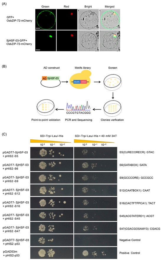 The molecular biology functions of SjHSF-03. (A) Subcellular localization of SjHSF-03 in rice protoplasts. OsbZIP72-mCherry was used as a nucleus marker. Scale bars = 50 μm. (B) TF-Centered Y1H workflow. (C) The binding of SjHSF-03 to seven motifs. The transformants were screened on SD/-His/-Leu/-Trp medium and SD/-His/-Leu/-Trp medium with 40 mM 3-Amino-1, 2, 4-triazole (3-AT). p53HIS2/pGADT7-p53 and p53HIS2/pGADT7-SjHSF-03 were used as the positive control and negative control, respectively.