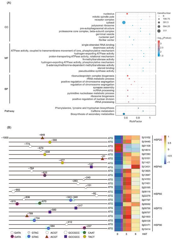 Analysis of the distribution of the CURECORECR, GATABOX, GCCCORE, CAATBOX1, CACTFTPPCA1, ACGTATERD1, and CGACGOSAMY3 motifs in the promoters (−1 to −1000 bp) of S. japonica genes identified a total of 9970 genes (Table S8). These motif-containing genes were subjected to GO and KEGG enrichment analyses (Tables S9 and S10). In the GO “Cellular Component” category, these genes were primarily enriched in terms such as nucleolus, mitotic spindle pole, cytosol, etc. For the “Molecular Function” category, enrichment was observed in terms related to single-stranded RNA binding, deaminase activity, ATPase activity, methyltransferase activity, steroid binding, and pseudouridine synthase activity. In the “Biological Process” category, these genes clustered predominantly into terms associated with ribonucleoprotein complex biogenesis, rRNA metabolic process, chromosome segregation, synapse assembly, ribosome biogenesis, and ncRNA/rRNA processing (Figure 7A). Especially, two key stress-related GO terms involved in “positive regulation of stress-activated MAPK cascade” and “positive regulation of stress-activated protein kinase signaling cascade” (Table S9). Additionally, KEGG pathway enrichment analysis identified three significantly enriched pathways: phenylalanine, tyrosine and tryptophan biosynthesis; caffeine metabolism; and biosynthesis of secondary metabolites (Figure 7A). Overall, these results suggest that SjHSF-03 may target the promoter of genes involved in a wide range biological processes and signaling pathways.