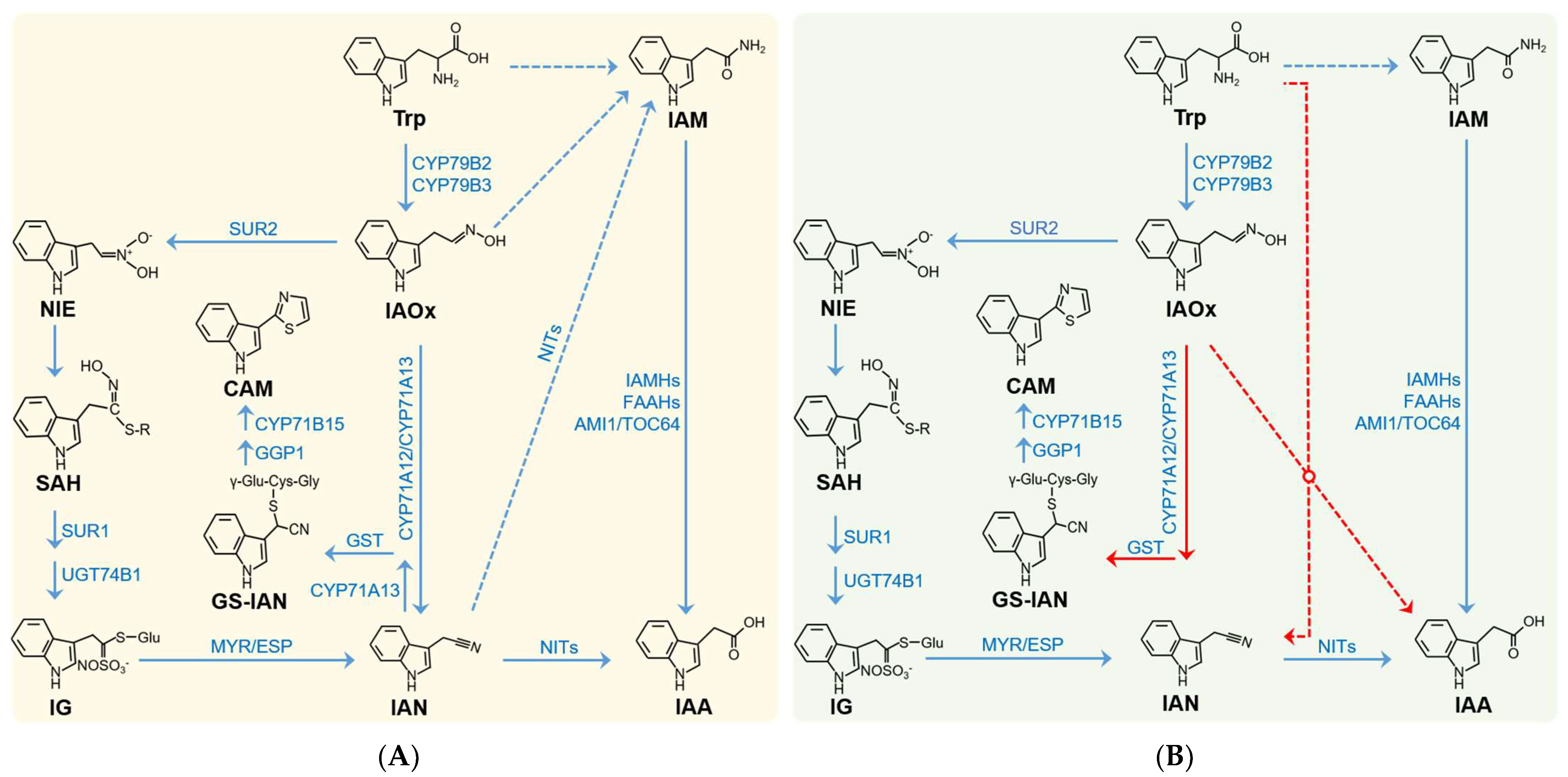 - Fenech, M.; Brumos, J.; Pěnčík, A.; Edwards, B.; Belcapo, S.; DeLacey, J.; Patel, A.; Kater, M.; Li, X.; Ljung, K.; et al. The CYP71A, NIT, AMI, and IAMH gene families are dispensable for indole-3-acetaldoxime-mediated auxin biosynthesis in Arabidopsis. Plant Cell 2025, 37, koaf242. [Google Scholar] [CrossRef]